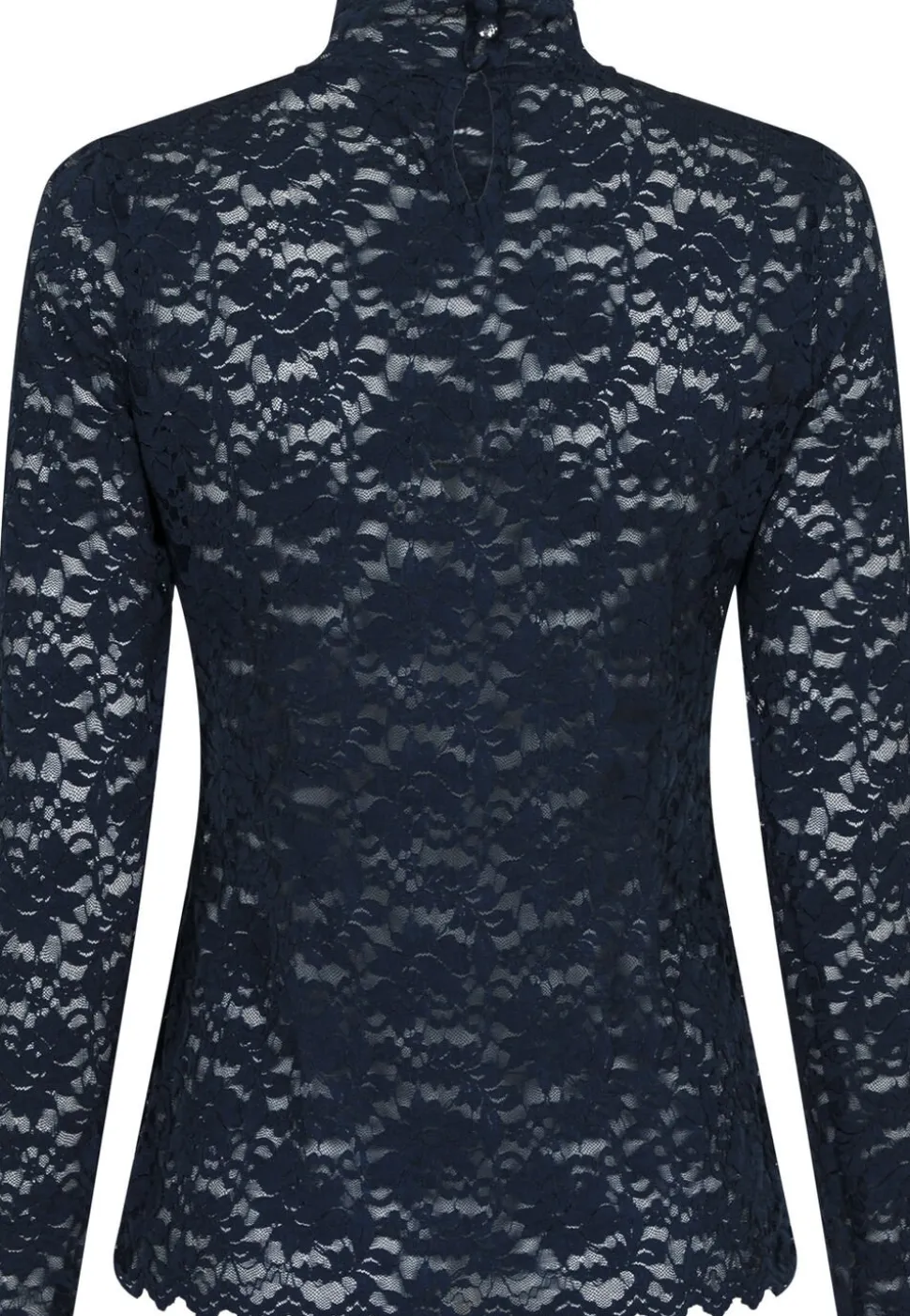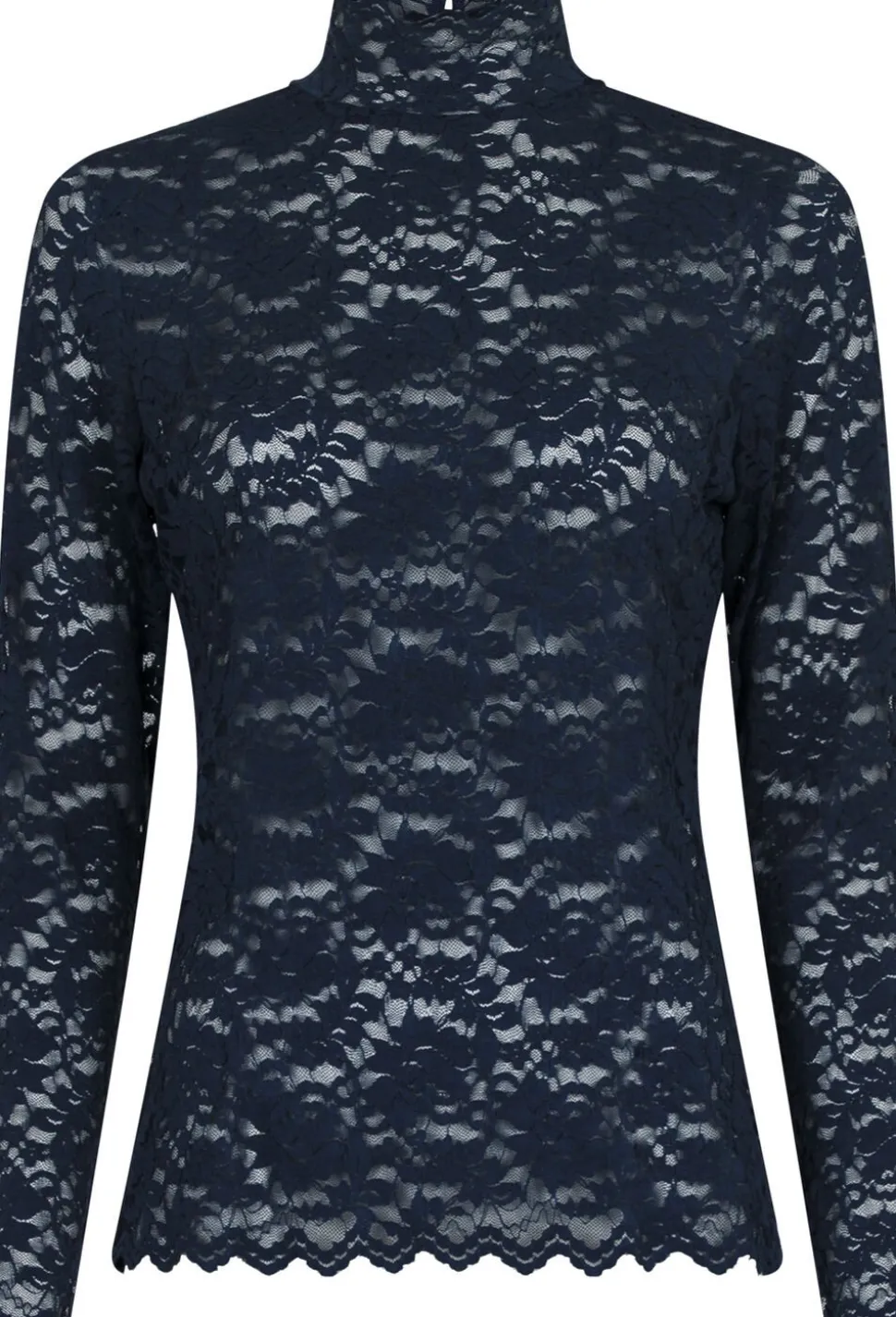 Langærmet bluse i en gennemsigtigt blondekvalitet. Blusen har en høj hals, lange ærmer, bølgede kanter og lukkes med en nøglehulslukning bagpå. Den er lavet i et strækbart materiale og har en tætsiddende pasform. Brug den alene eller som en fin detalje under en blazer eller strik. Modellen er iført størrelse 36.