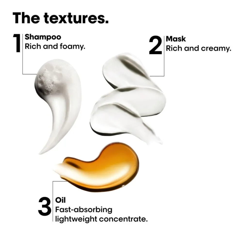 3. Påfør dagligt i tørt eller håndklædetørt hår. Opvarm 1 eller 2 pump i håndfladen, og fordel jævnt fra mellemlængder til spidser. Skyl ikke ud. Fortsæt med at føntørre eller lufttørre.