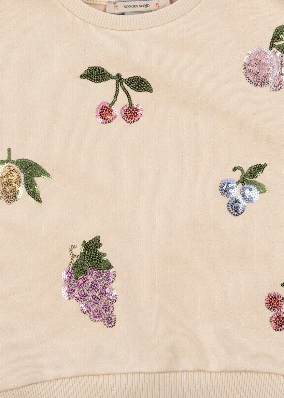 – Unikt design: Det sjove og farverige frugtmotiv med pailletter tilføjer et legende touch, der gør denne sweat shirt til et hit blandt børn.