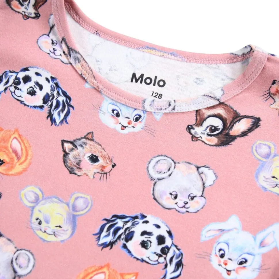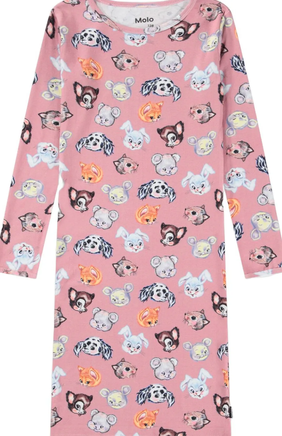 Denne lyserøde natkjole fra Molo er lavet af økologisk bomuld med et smilende ansigt-print. Kjolen har lange ærmer, en rund halsudskæring og en løs pasform.
