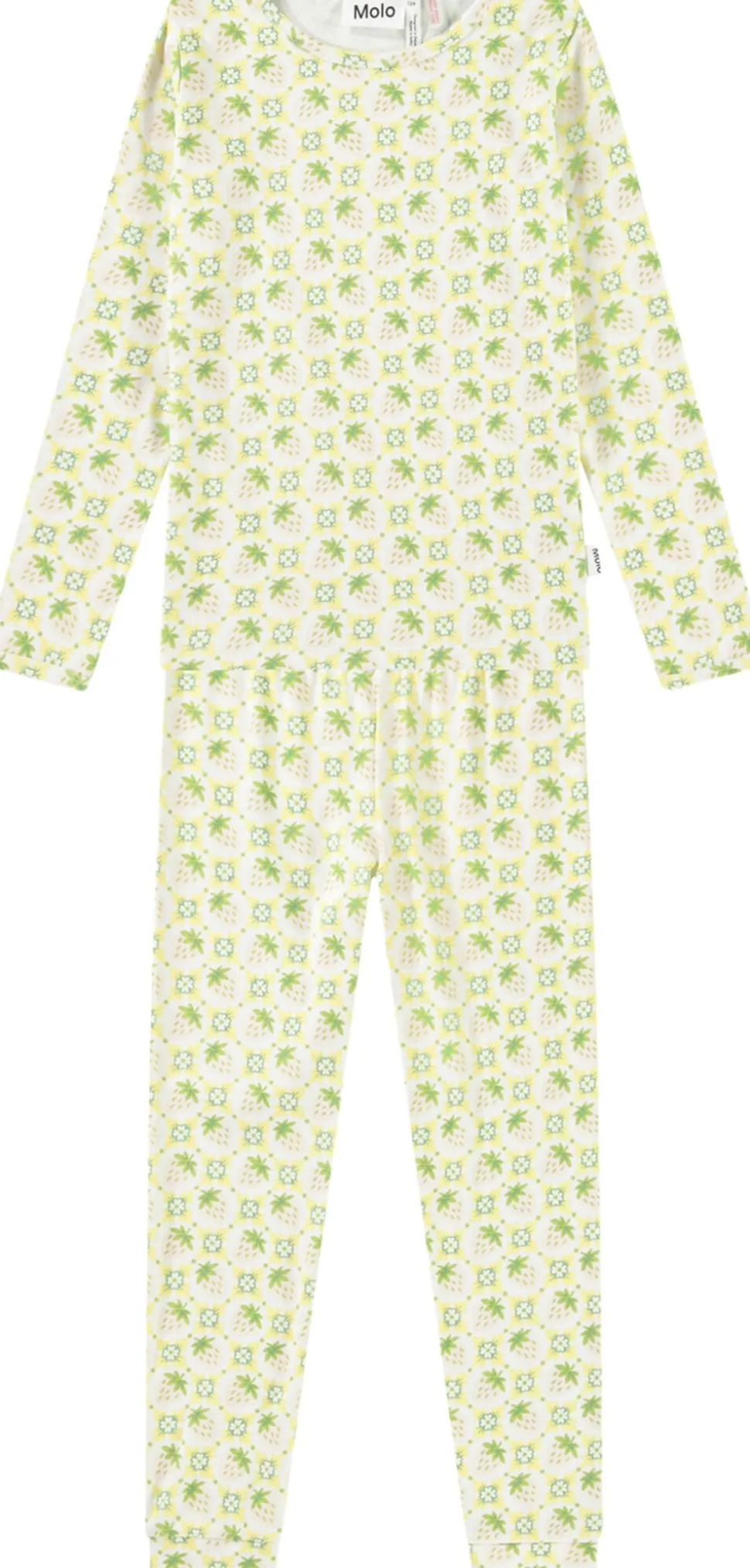 Nattøj med lange ærmer og ben i strækbart økologisk bomuld. Sættet er todelt og inkluderer en tætsiddende bluse med rund hals samt et par bukser med elastik i taljen for optimal komfort.