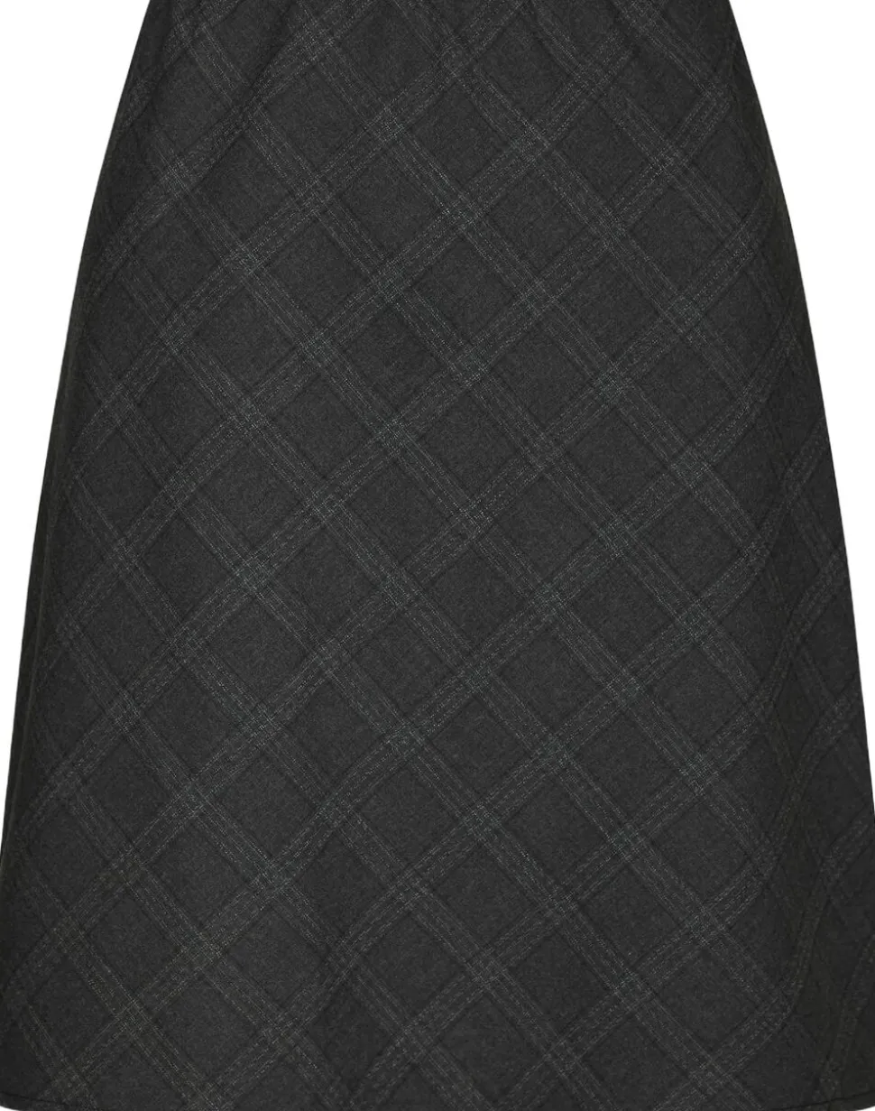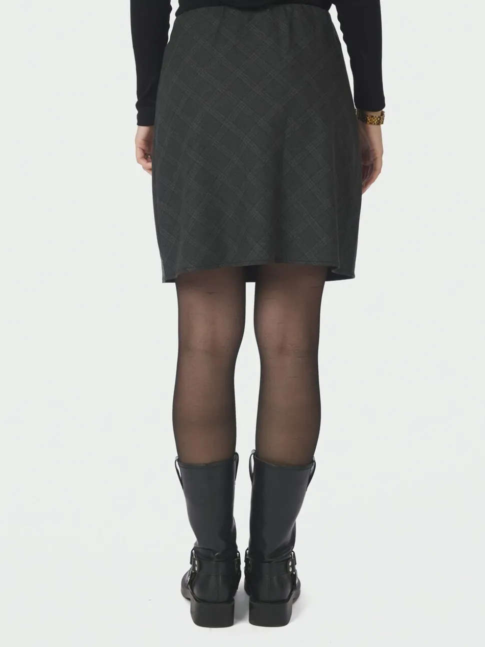 Kort nederdel med tern. Nederdelen har elastik i taljen og en almindelig pasform. Modellen er iført størrelse 36.