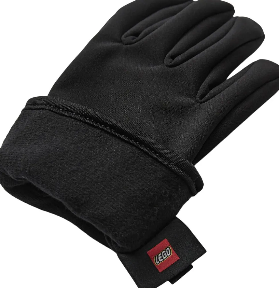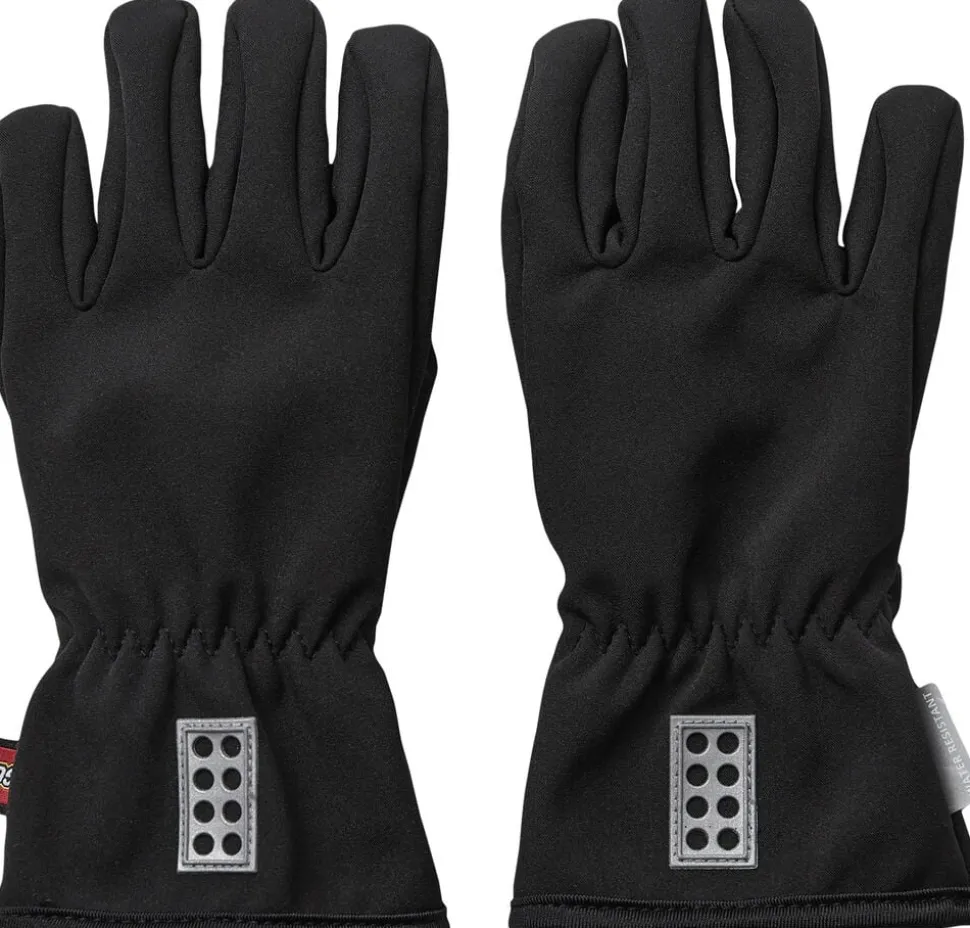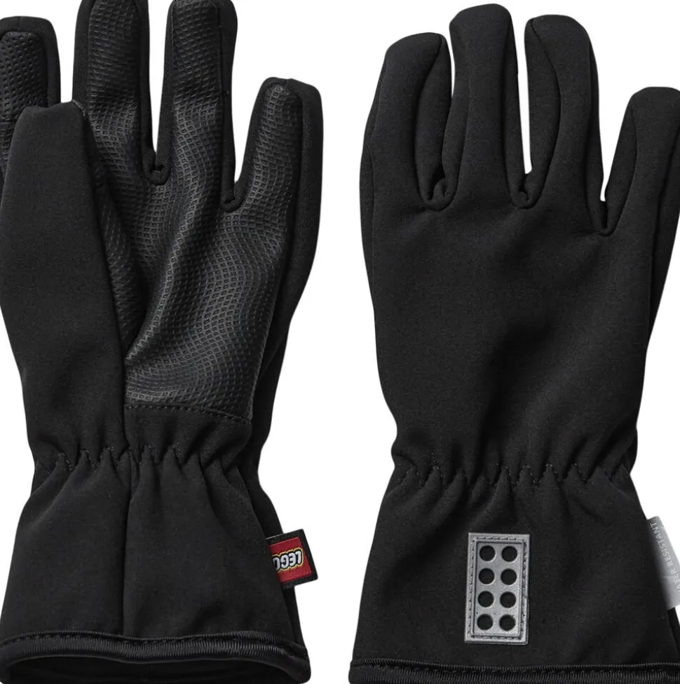 Vandafvisende sorte LEGO softshellhandsker til børn. Ved håndleddet er der en elastik, så handskerne sidder behageligt, og på forsiden er der en LEGO klods formet refleks. Børne softhell handskerne har et vandsøjletryk på 8.000 mm og er åndbare og vindtætte. I håndfladen er der en PU-coating for et bedre greb. Med en fluorfri imprægnering.