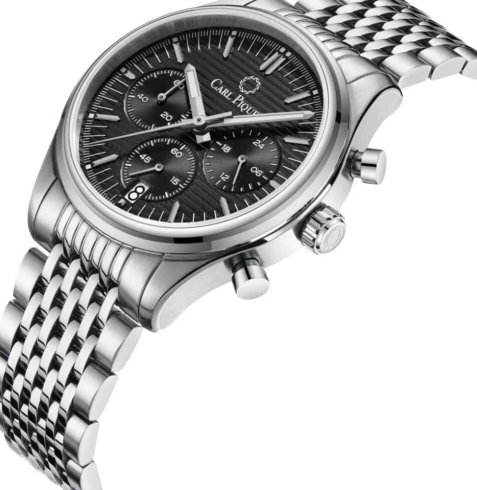 Carl Pique Maurice CP0060 uret kombinerer klassisk design med praktisk funktionalitet. Det har en rund urkasse og en detaljeret urskive med tre kronografer og en datovisning, der tilføjer dybde til udseendet. Den sorte urskive står i imponerende kontrast til den sølvfarvede urkasse og bezel. Uret er udstyret med kvarts urværk drevet af TMI VD54 kaliber.