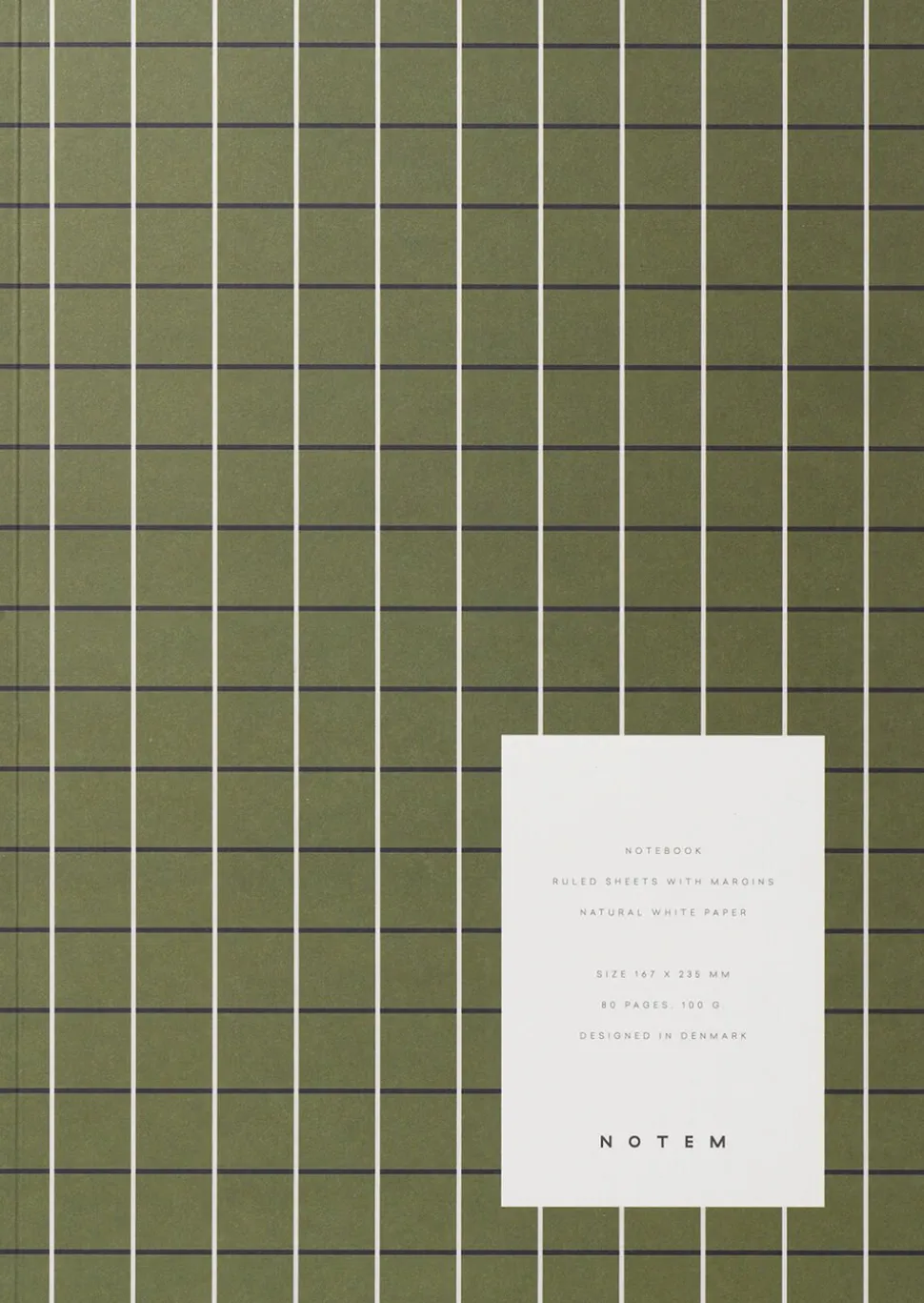 Softcover notesbog fra Notem Studio. Indhold: 80 sider, linjerede sider. Farve: Grøn. Mål: 167 x 235 mm.