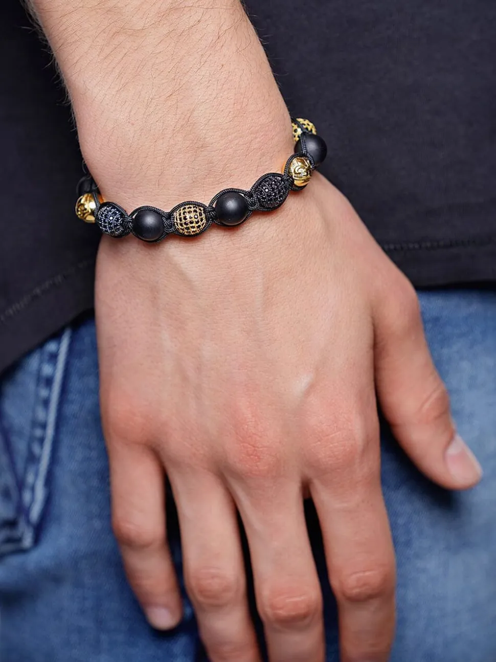 Beaded-armbånd til Herre med 10 mm Matte Onyx, 10 mm guld og sort CZ-diamanter og lås i rustfrit stål med 18K guldfinish. Håndlavet i Los Angeles.