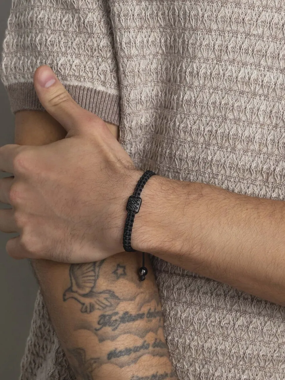 String-armbånd med sort nylonstreng. Lås og perle er lavet af rustfrit stål med sort plade. Black Cubic Zirconia er også inkluderet. Håndlavet i Los Angeles