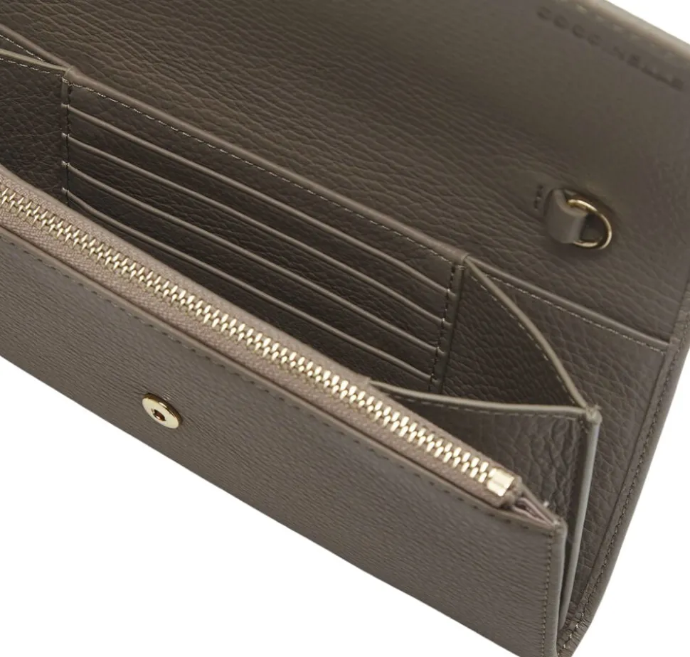 Smart minibag-wallet fra Coccinelle. Tasken/pungen lukkes med trykknap. Indvendigt er der 2 rum. I det ene rum er der f.eks. plads til en mobiltelefon. I det andet rum er der 8 rum til kort. Desuden lynlåsrum med plads til f.eks. mønter, nøgler el.l. Aftagelig, justerbar skulderrem i skind