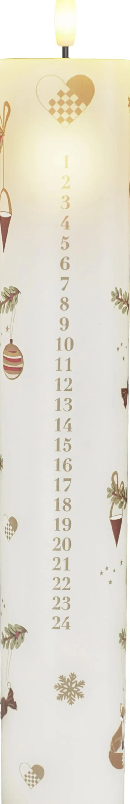 Voks kalenderlys med 3D flamme der lyser med et varmt hvidt lys. De 24 tal indikerer dagene til juleaften, der er integreret LED lys, som lyser ud for den ønsket dag. Der medfølger special fjernbetjening til lyset.
