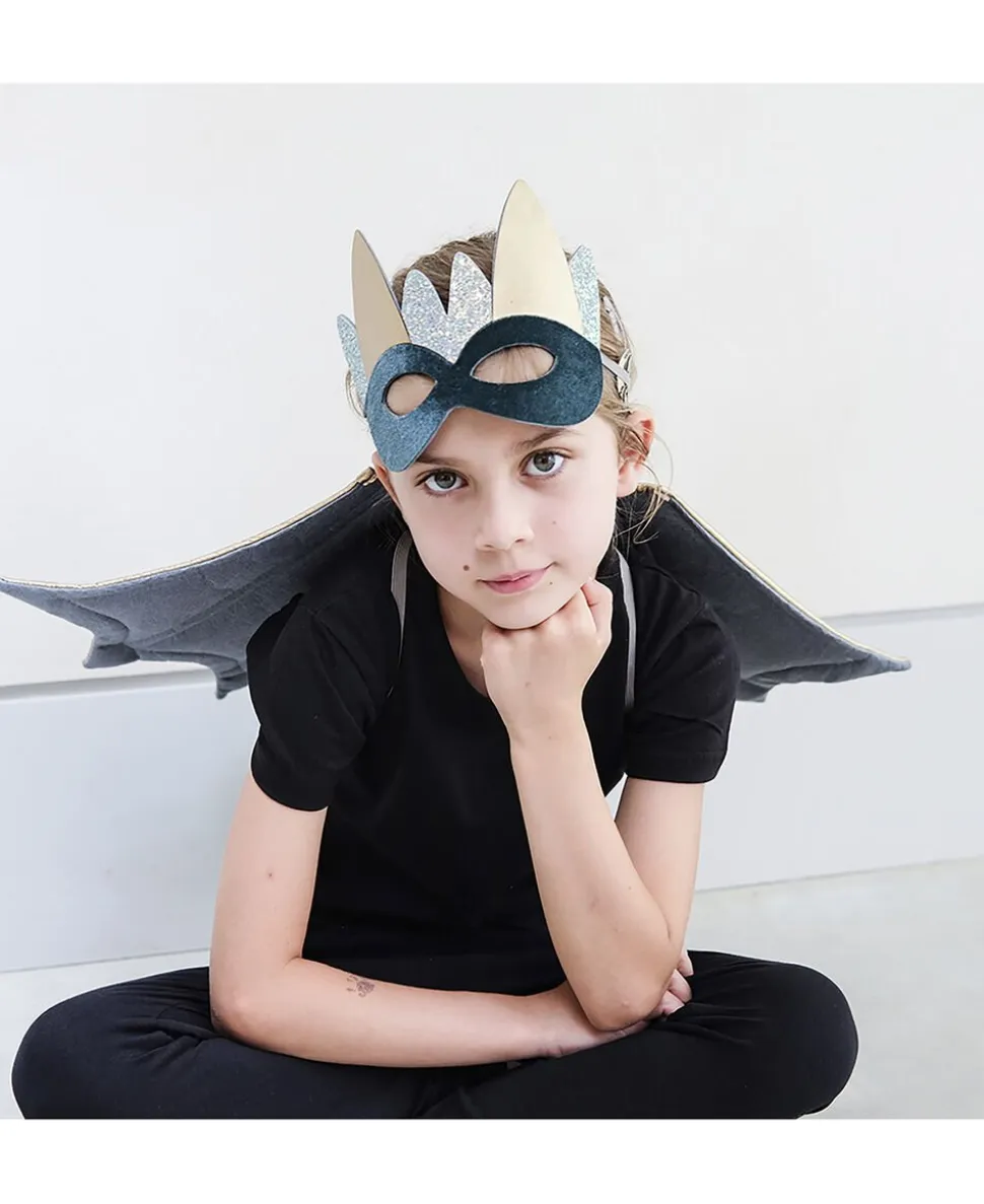 Sort dragemaske med guld og glimmerdekoration. Maskens strop er elastisk, så den passer til børn i alderen 3-8 år.