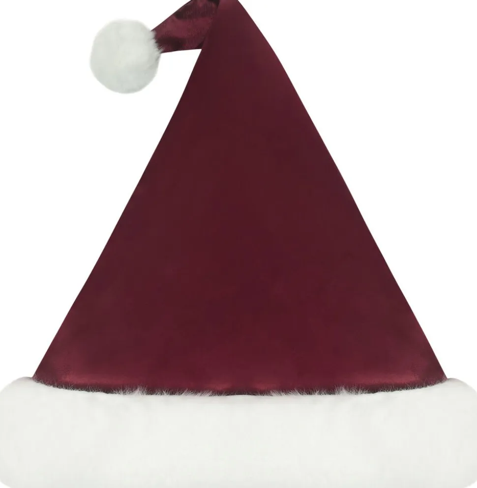 Flot vinrød nissehue med hvide plyskanter og kvast.