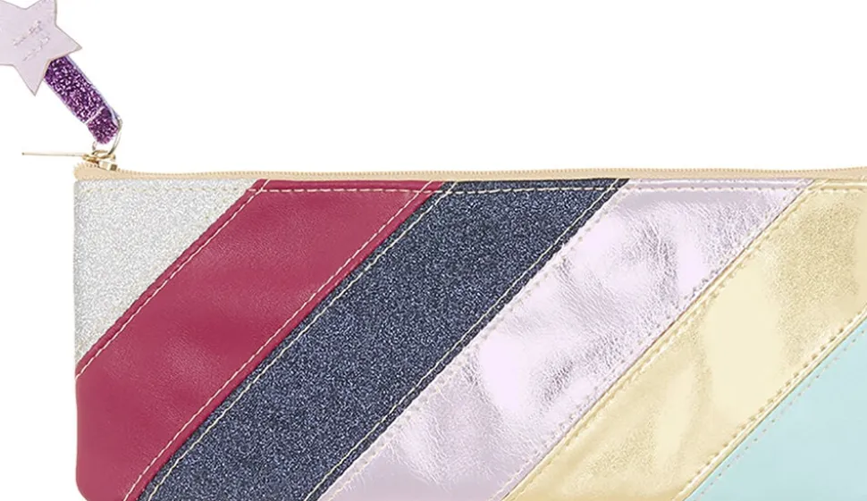 Penalhus med diagonale striber i flotte farver samt et lille stjerneskud-vedhæng på lynlåsen.
