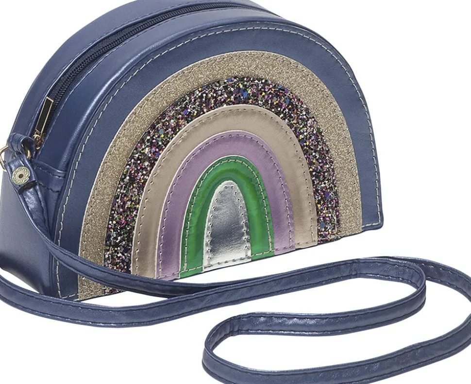 Halvmåneformet blå skuldertaske med strop, lynlås og skinnende regnbuedekoration.