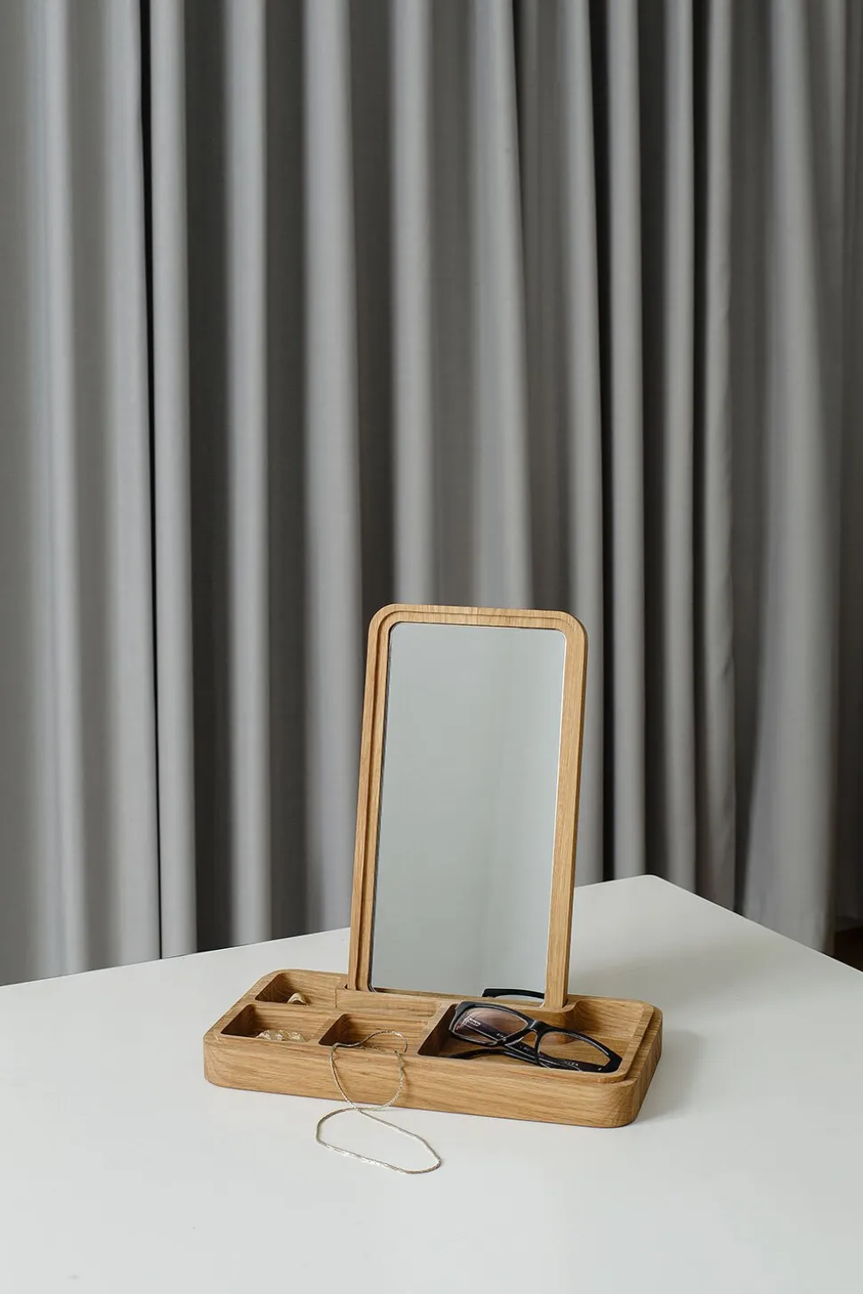 Mirror Box er et unikt håndlavet og håndsamlet træprodukt, der vil have variationer fra version til version. Rens med en fugtig klud. Brug bivoks regelmæssigt på alle vores træprodukter, så holder de længere.