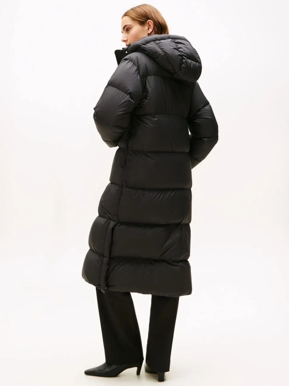 Denne dunfyldte pufferfrakke har en lang silhuet med en tætsiddende hætte og en vandafvisende finish for ekstra beskyttelse mod elementerne.