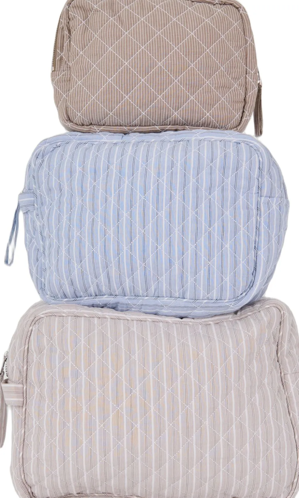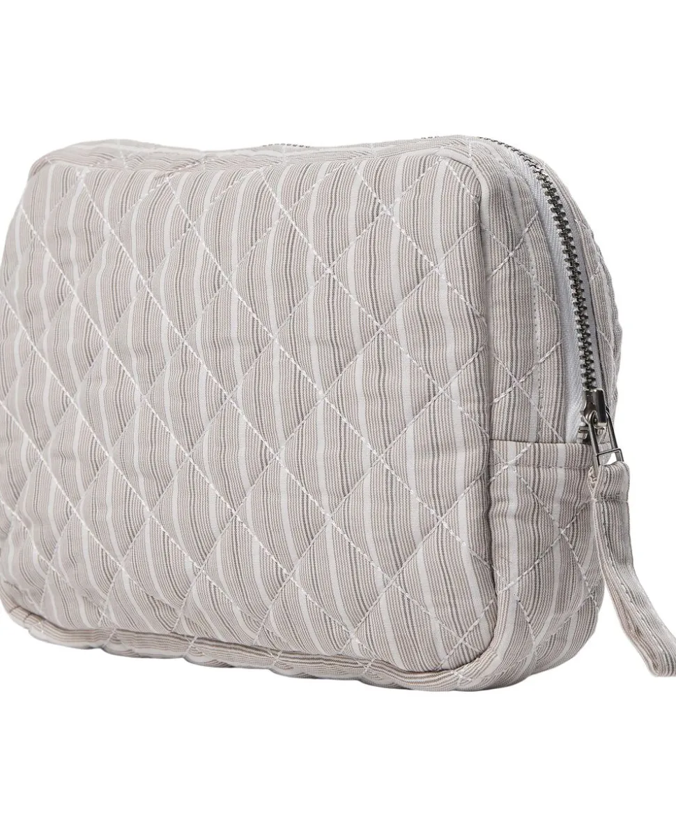 Toilettaske fra Magasin du Nord Collection i den blødeste kvalitet af 80% økologisk bomuld med GOTS-certificering. Toilettasken består af ét stort rum med lynlåslukning samt mindre inderlommer. Derudover har toilettasken fine vatterede syningsdetaljer og et stribet print. En skøn toilettaske i den lækreste kvalitet.
