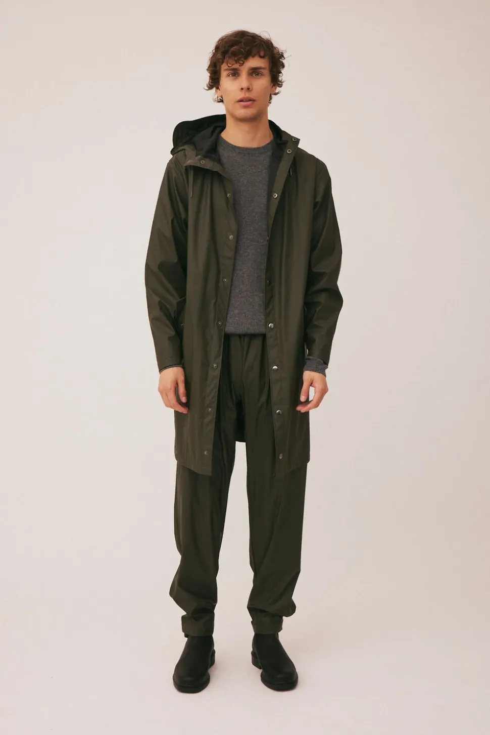 Jakken er klassisk og enkel i modellen med knapåbning samt justerbar hætte.