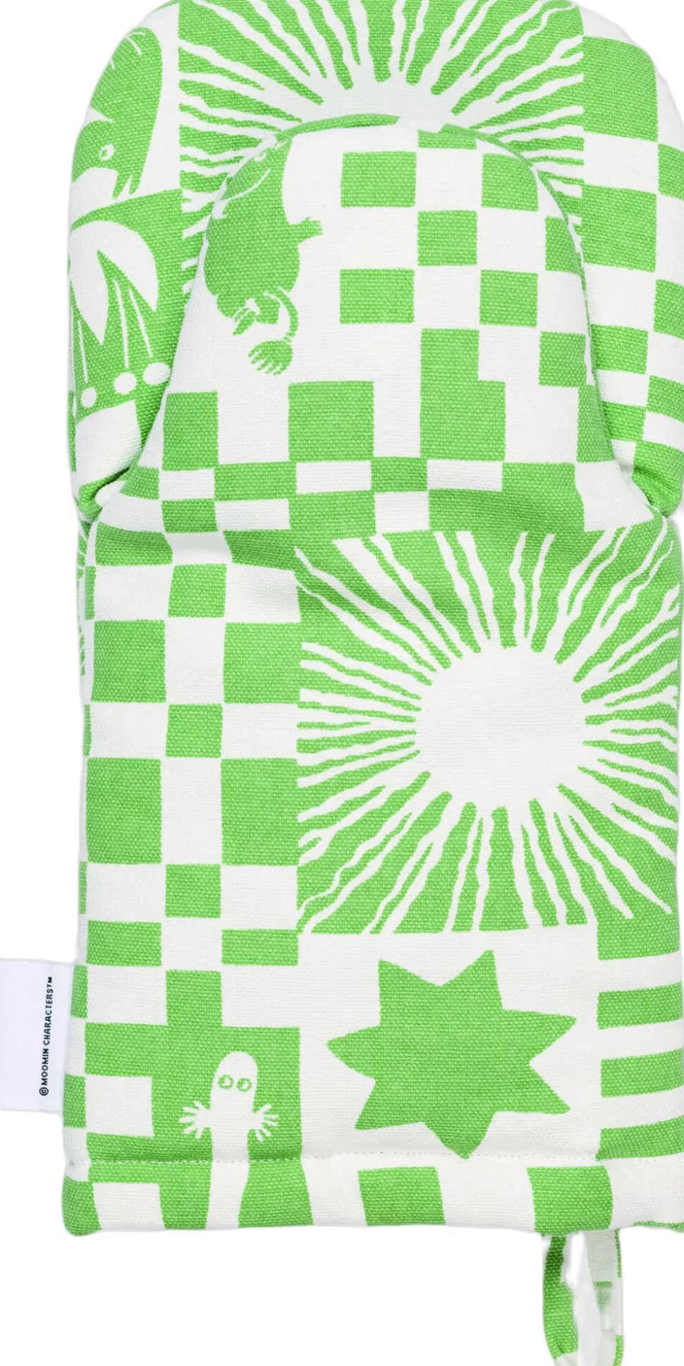 Få sommerstemning i køkkenet! Festkollektionens legende mønstre er baseret på tidlige mumimønstre fra 1950’erne med mange sjove elementer. Tilbered et lækkert måltid i stil med de livsglade mumier, og inviter dine nærmeste med til festen! Moomin Arabia-grillhandske, grøn, Fest