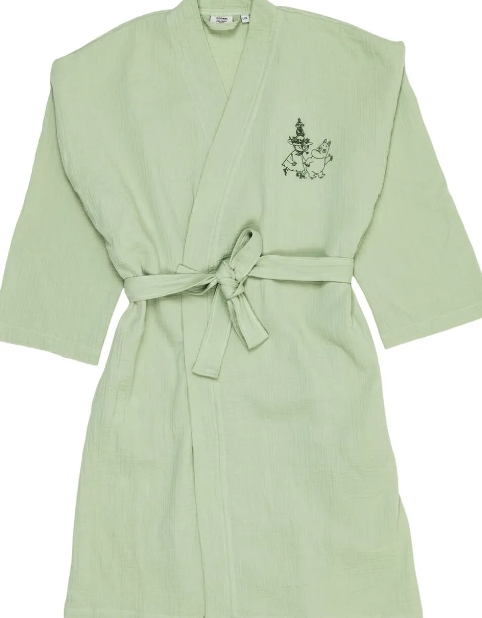 Moomin 80 kollektionen er en hyldest til de værdier, der forbinder os med Moominhistorierne: kærlighed, venskab og accept. Den mest centrale lektie fra Moominhistorierne er, at tid tilbragt med familie og venner er uvurderlig. Moomin Arabia musselinbadekåbe L/XL, grøn GOTS