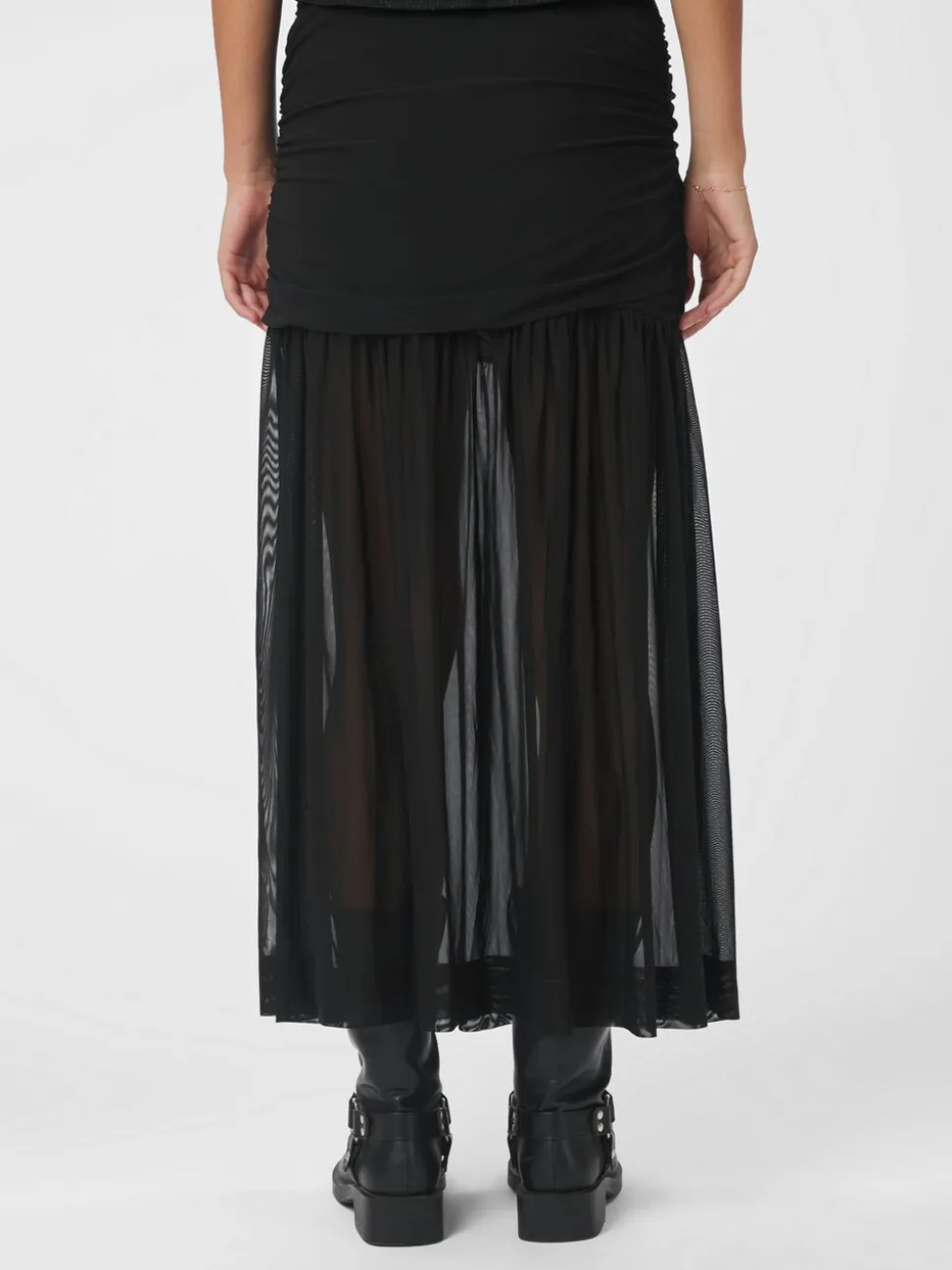 Maxinederdel i mesh. Nederdelens øverste stykke er tætsiddende og draperet, mens det nederste er designet med vidde. Den har elastik i taljen og et kort, påsyet underskørt. Pasformen er almindelig. Modellen er iført størrelse 36.