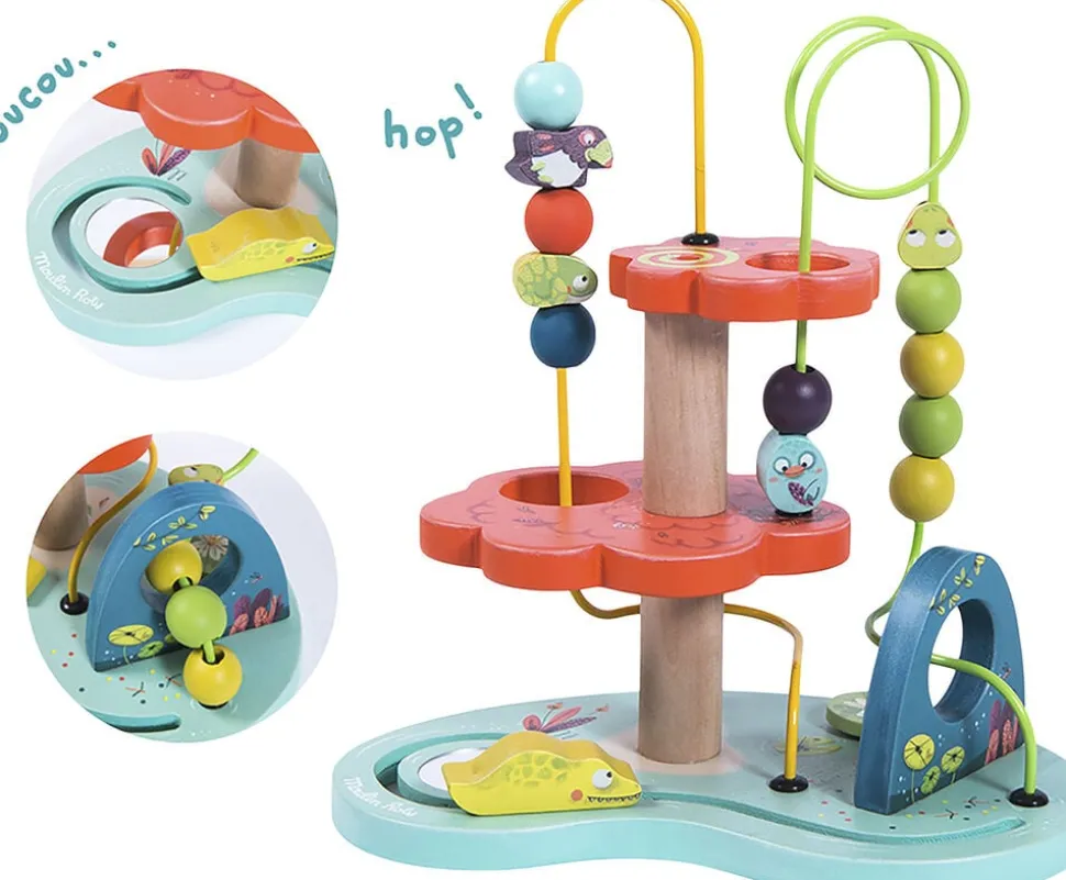 Dette farverige trælegetøj hjælper børn med at udvikle deres motoriske færdigheder. Der er også et lille spejl for at fremme selvkendelse.