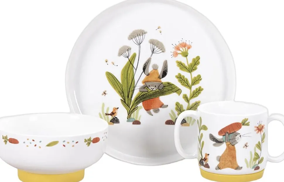 Spisesæt af porcelæn, så der kan spises som de voksne, med fine illustrationer fra serien Trois Petits Lapins.