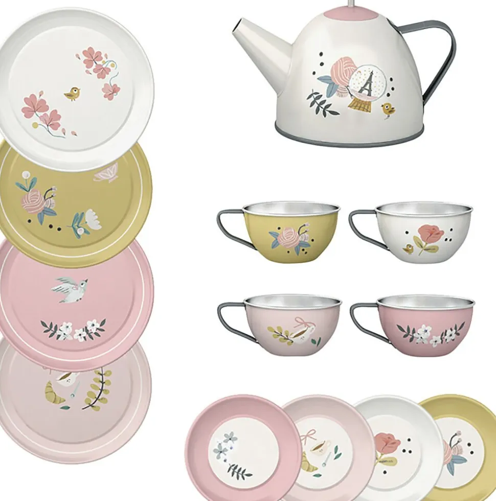 Metal testel i en fin kuffert. Delene er i pastelfarver med blomstermønster og små parisiske illustrationer af Lucille Michieli.