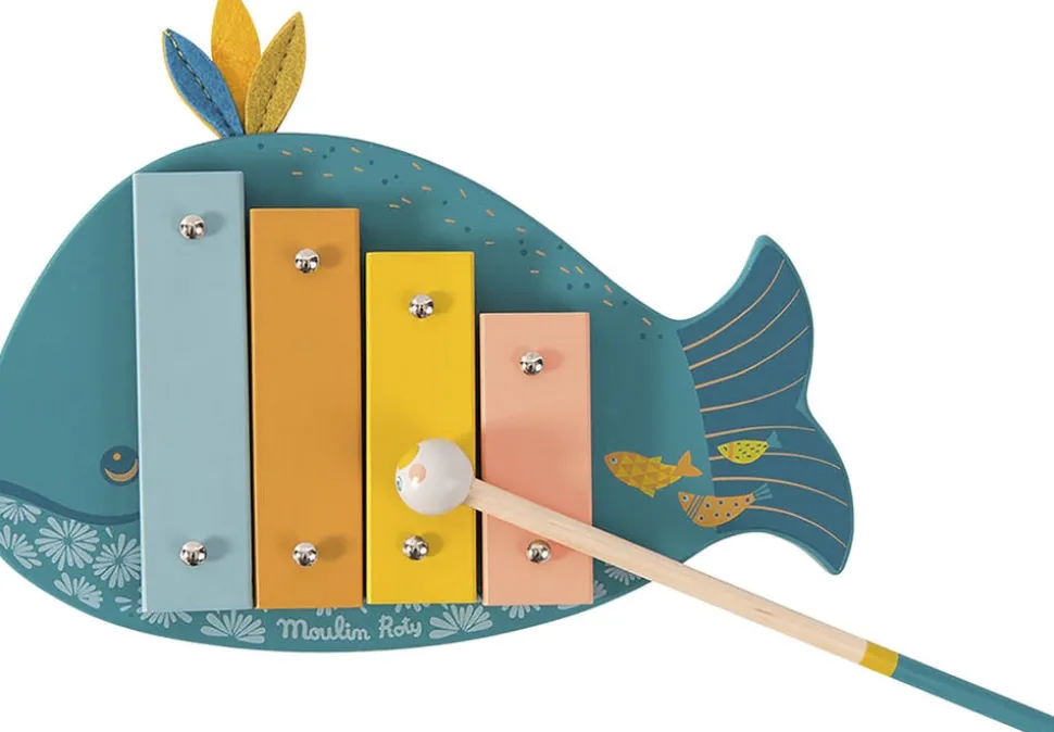 Xylofon udformet som hval med fire toner og en medfølgende trommestik.