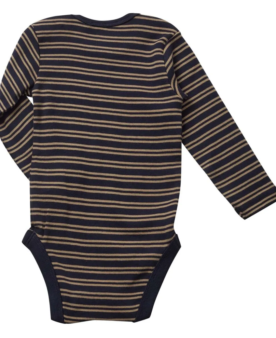 Body fra Magasin du Nord Collection i den blødeste kvalitet af 100% økologisk bomuld med GOTS-certificering. Bodyen er enkel i modellen med et stribet mønster, lange ærmer samt knaplukning i kilen og ved den ene skulder. En skøn body i den lækreste kvalitet.
