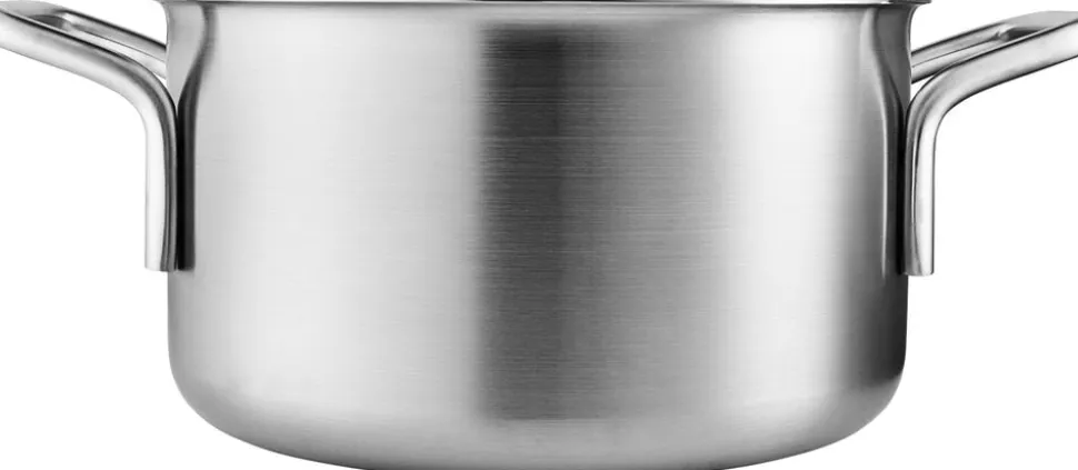 Gryden forener Eva Trios klassiske formsprog og velkendte kvalitet med næste generations forbedringer og materialer. Indersiden er belagt med et iøjnefaldende mønster, der består af rustfrit stål øverst og keramisk Slip-let® belægning nederst. Denne kombination mindsker risikoen for, at maden klæber eller brænder fast, samtidig med at belægningen er så hårdfør, at du trygt kan anvende metalredskaber uden risiko for at beskadige den. Grydens korpus er fremstillet af en kombination af 85-90 procent genanvendt post-consumer rustfrit stål og 100 procent genanvendt post-consumer aluminium. Den unikke Multi-layer 3-lags teknologi sikrer hurtig opvarmning, jævn varmefordeling og en hård yderside, der modstår slid og brug. Gryden tåler ovnbrug op til 400°C og er velegnet til alle varmekilder, inklusive induktion. Den kan nemt rengøres i opvaskemaskinen eller med en stålsvamp. Designet er baseret på det klassiske Ole Palsby/Eva Trio-design fra 1977, hvilket sikrer, at gryden fortsat byder på de velkendte Eva Trio-kvaliteter såsom kolde greb, hældekant, stabelbarhed og kompatibilitet med låg og andre dele af Eva Trio-serien.