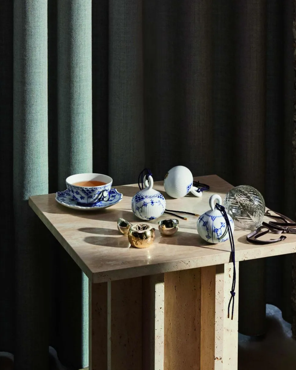 Musselmalet Riflet julekuglen tilføjer et strejf af historie og håndværk til dine juledekorationer. Alsidigheden af Royal Copenhagens mønster nr. 1 skinner igennem på dette stykke porcelæn, da dekorationen smukt omslutter den organiske form af kuglen.