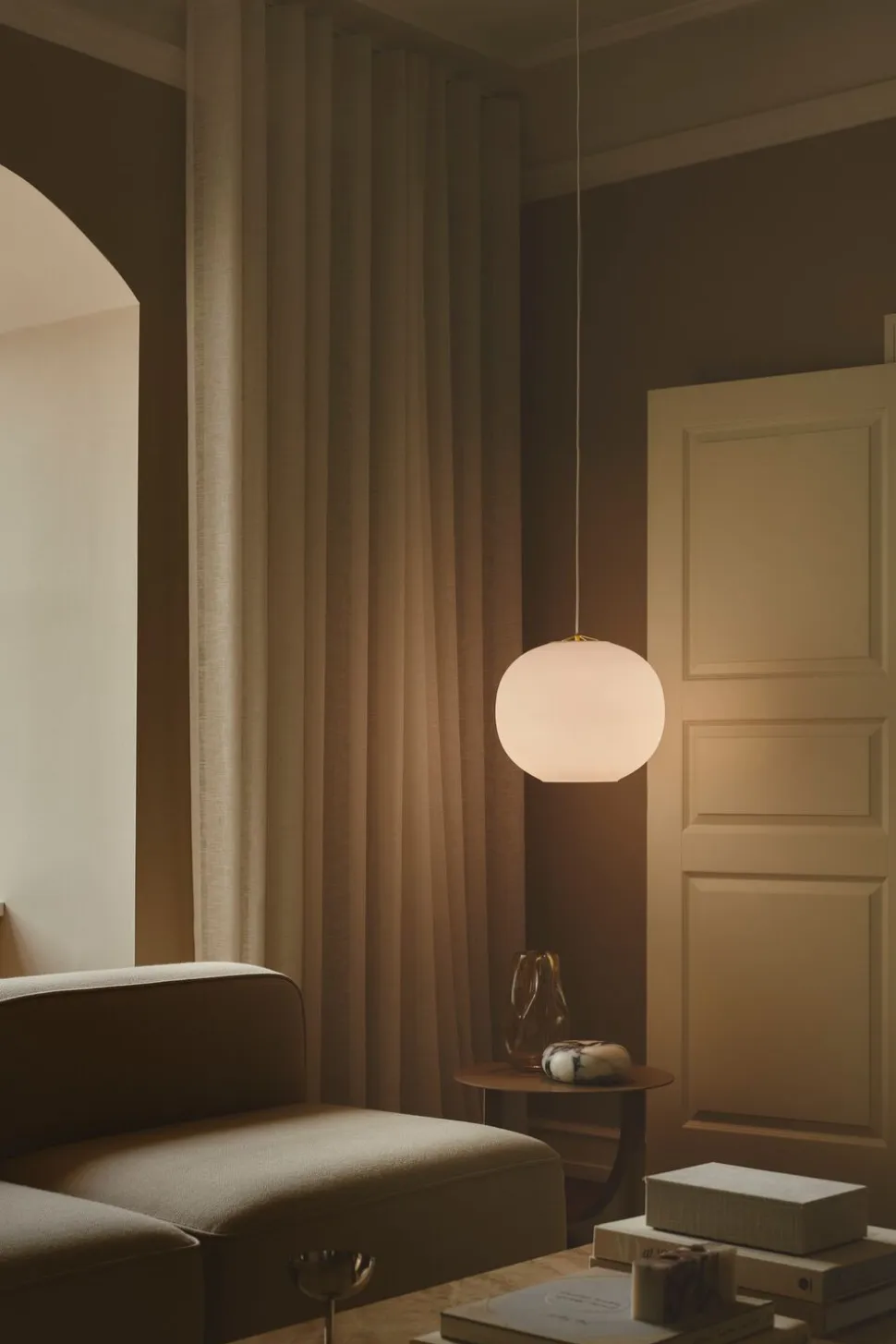 Navone pendlen fra Design For The People er designet af Studio Mavro//Lefèvre og kendetegnes ved sin runde skærm i opalglas og karakteristiske bløde kurver.