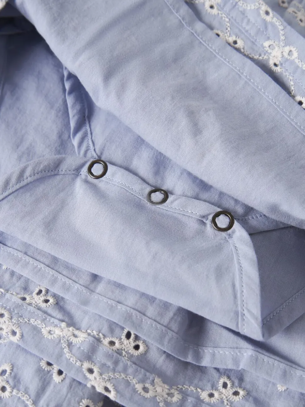 Broderie anglaise er karakteriseret ved sine broderede detaljer og hulmønstre, som giver et elegant udtryk.