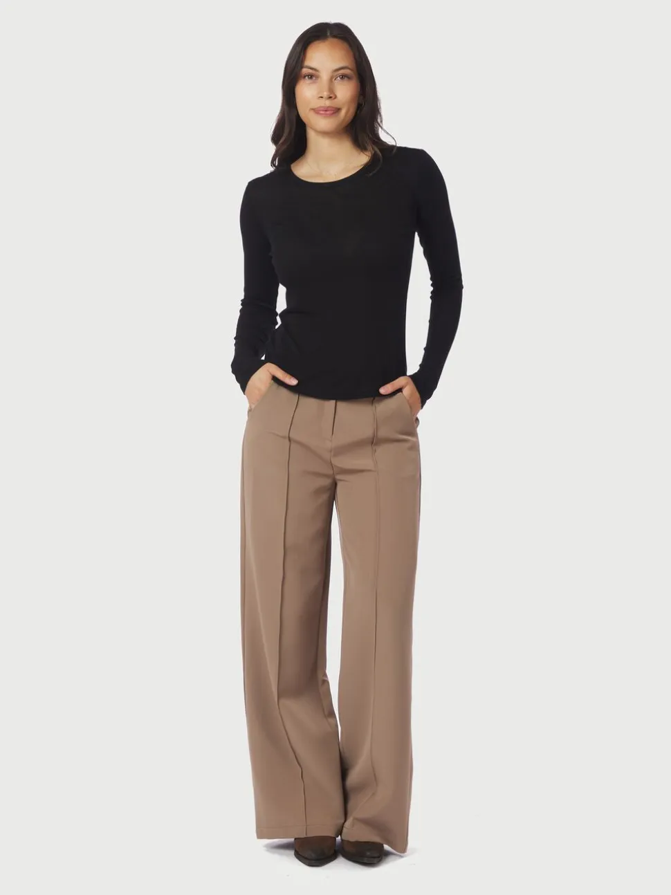 Langærmet bluse i en blød ribkvalitet. Blusen har en rund halsudskæring og en tætsiddende pasform. Den er lavet i en blød lyocell- og uldblanding. Modellen er iført størrelse 36.