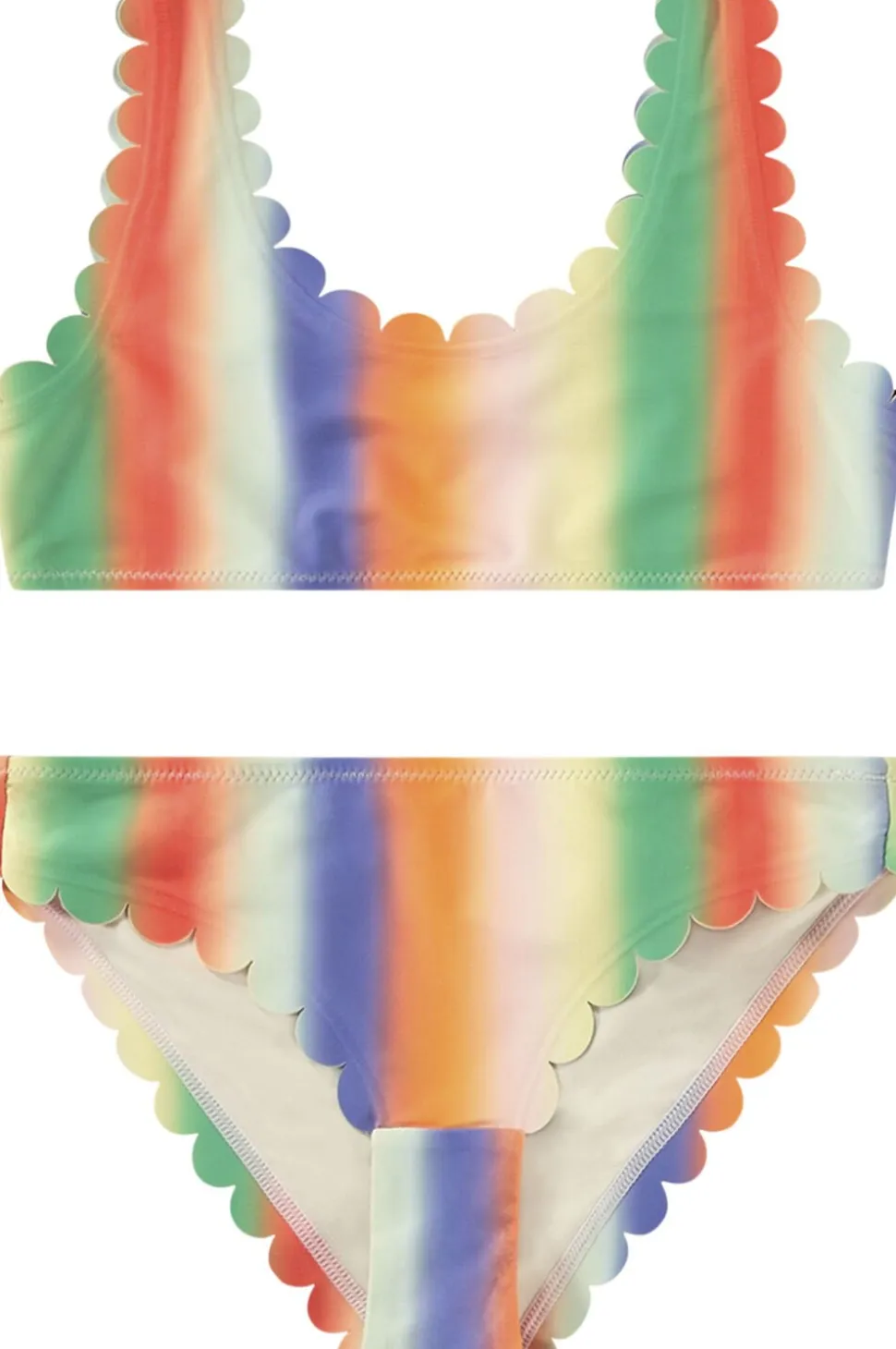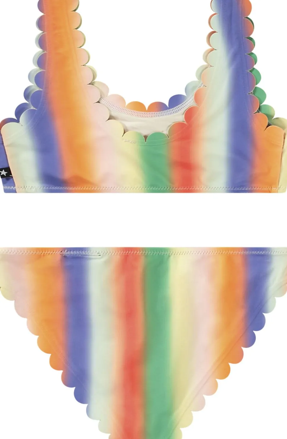 Bikini til aktive børn, lavet af genanvendt polyester med UV-beskyttelse 50+. Overdelen er bred med dyb ryg og brede stropper, samt bløde, bølgede kanter ved hals og ærmer. Underdelen har elastik i taljen, bløde bølgede kanter ved benene, normal pasform, og er fuldt foret.