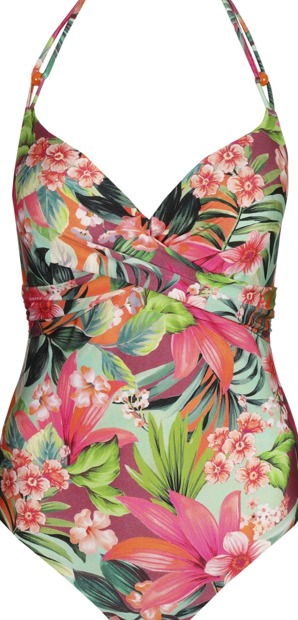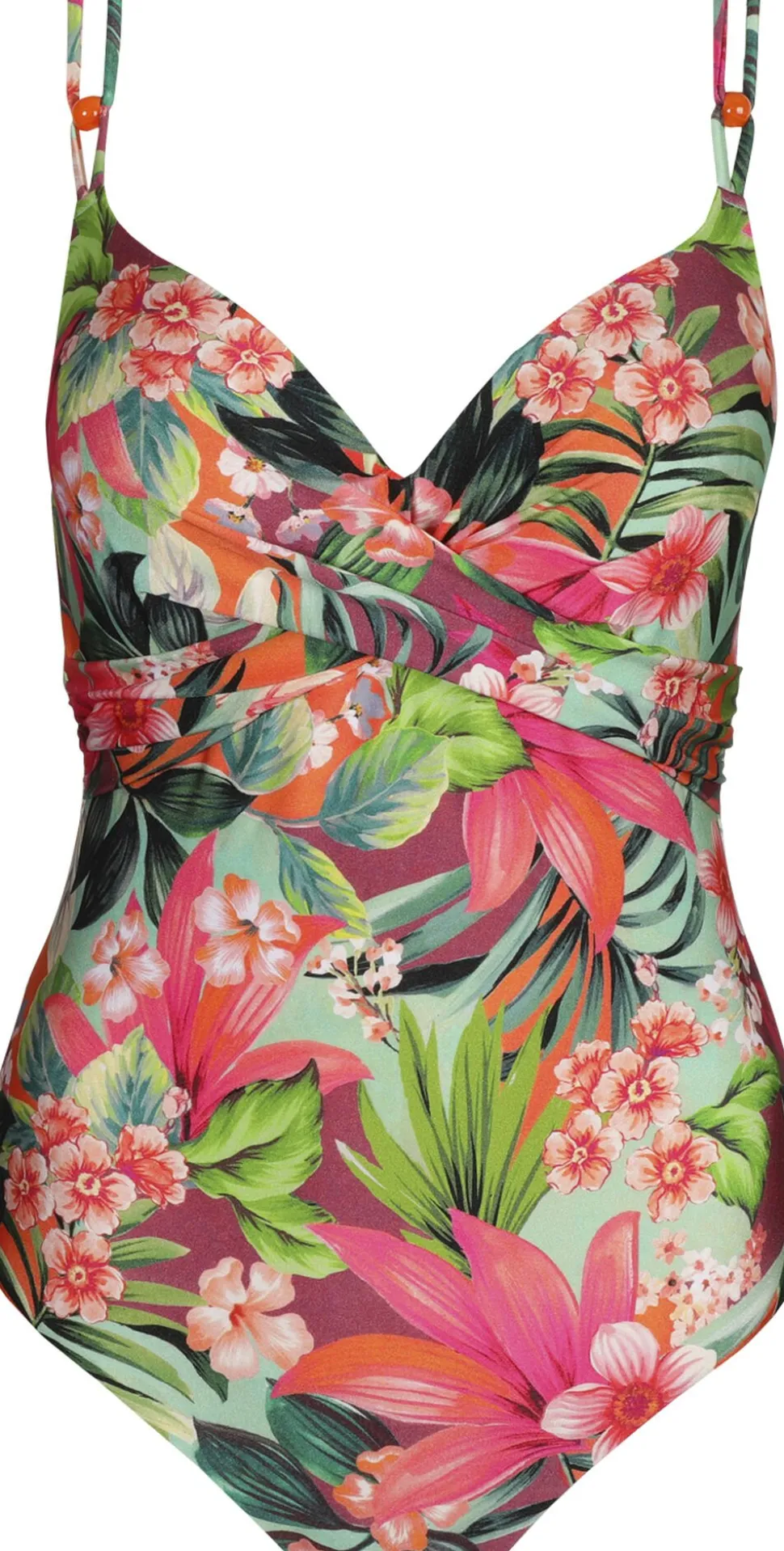 Sexet plunge-badedragt med komfortabelt polstrede skåle. En blød blanding af tropiske nuancer