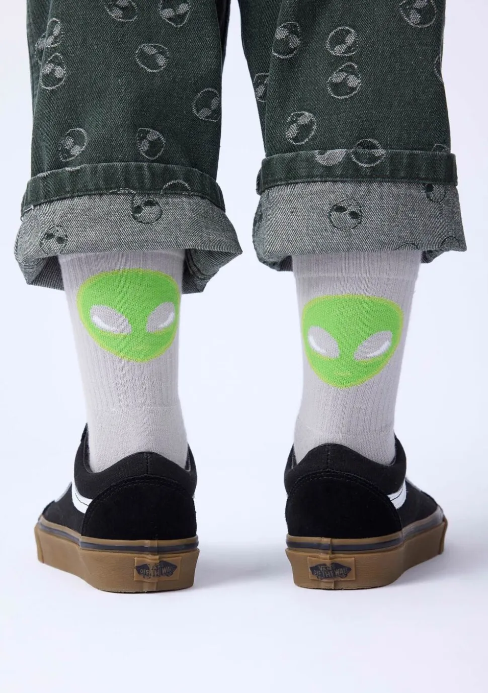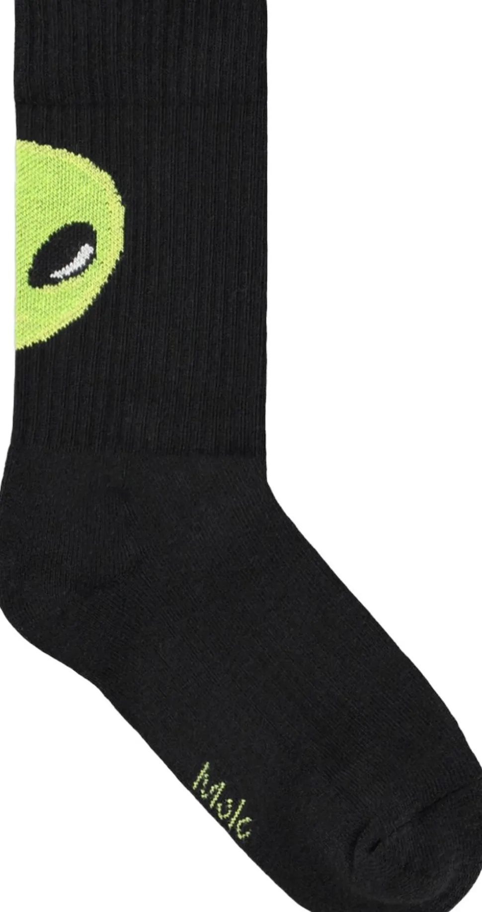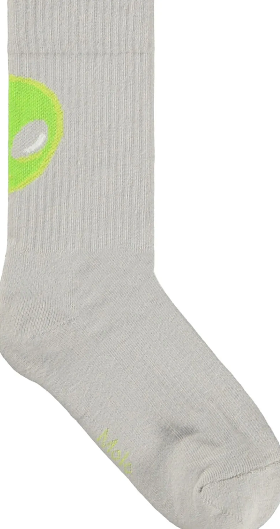 2-pak strømper fra Molo i blødt bomuld med ribbet skaft og elastik foroven. Pakken indeholder et par sorte strømper og et par grå strømper, begge med printede alien hoveder bagpå.