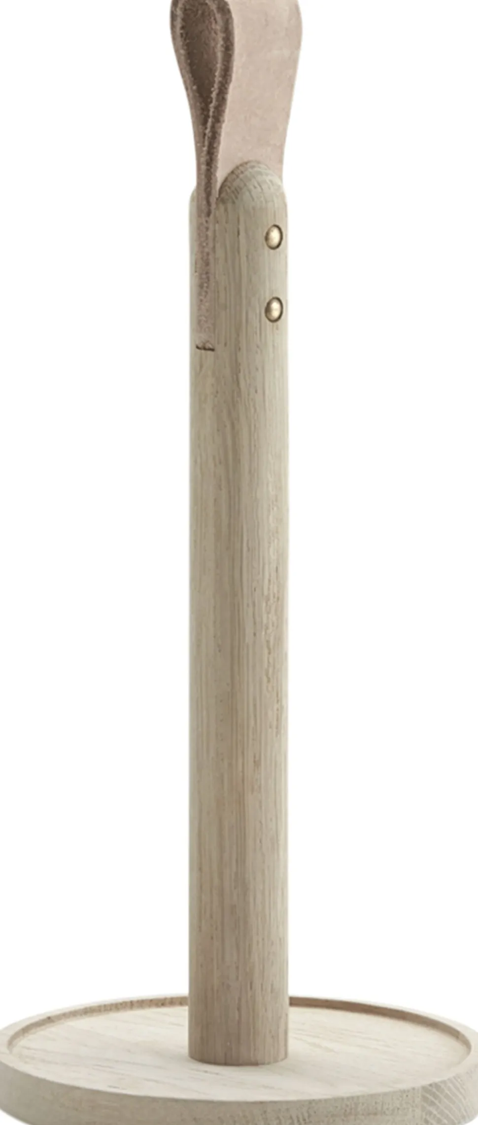 Ditte Buus Nielsens køkkenrulleholder i træ, læder og nitter taler et nordisk formsprog, mens kanten i bunden sørger for, at papiret ikke ruller sig selv ud. Læderhanken er både detalje og praktik, da stroppen gør den nem at flytte rundt.