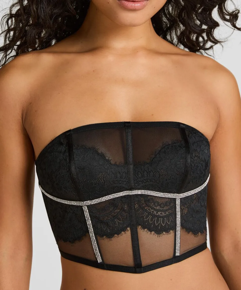 Gør et statement med denne fantastiske bustier. Den er designet med mesh- og blondepaneler og fremhæves af glimmer, der fanger lyset ved hver bevægelse. De ikke-vatterede skåle giver en naturlig silhuet, mens den strukturerede pasform former og støtter blidt. Fuldend looket med den matchende underdel.