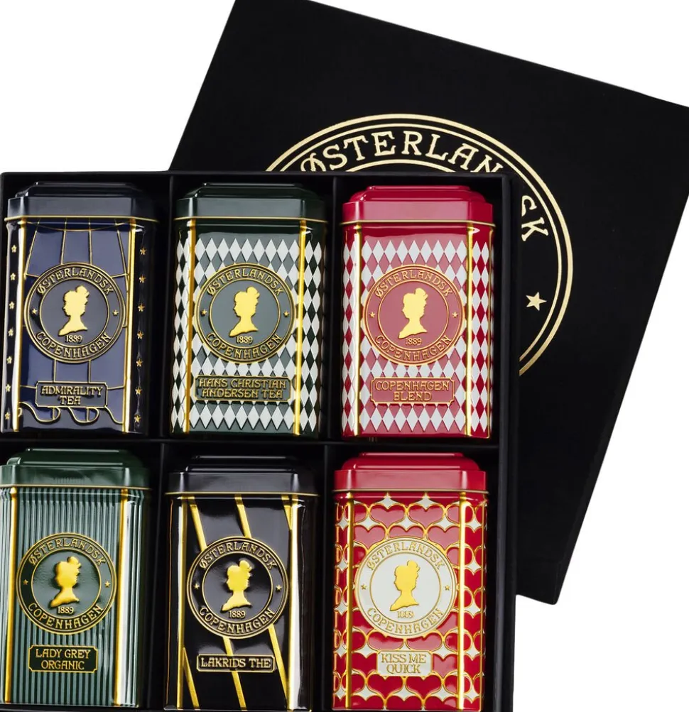 Luksus Velour-gaveæske med 6 tebrevsdåser af vores mest populære Sorte Te’er (Admiral, Copenhagen Blend, HC Andersen, Kiss Me Quick, Lady Grey) samt Lakrids The