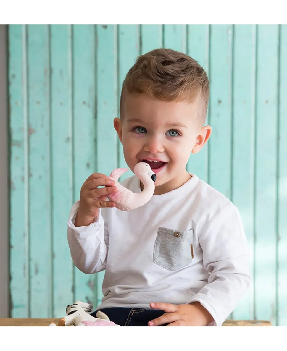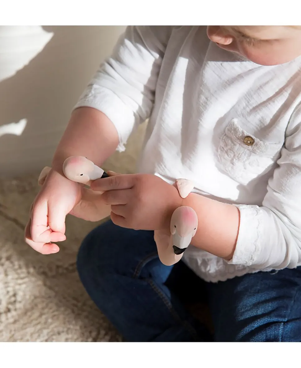 En sød lille ven udformet som et armbåndBlød og let at gribe om og til tage rundt om håndleddet. Små børn elsker teksturen af Hevea gummi. Det er dejligt at bide i når gummerne begynder at klø, når den første tand skal frem. Håndlavet i 100% naturlig Hevea gummi og håndmalet med naturlige pigmenter udvundet fra planter. Produceret uden hul, så den kan komme med i bad.
