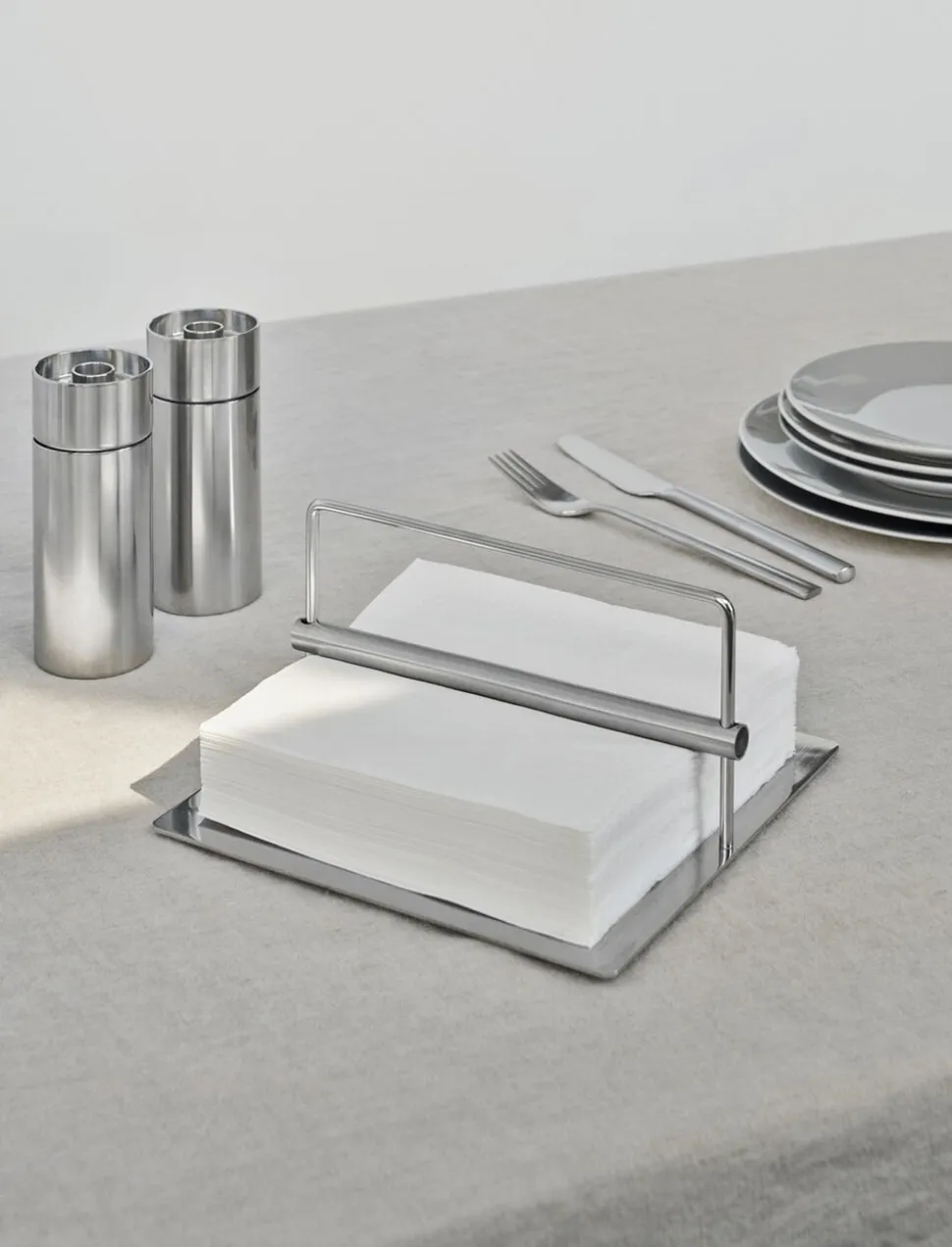Æstetisk servietholder i rustfrit stål, designet af Peter Holmblad. Servietholderen er enkel og stilren i sit udtryk og samtidig utrolig funktionel på køkkenbordet og havebordet. Holderen sørger for at holde servietterne pænt stablet, selv når vinden blæser, og den er perfekt egnet til havefester og til serveringer på terrassen eller altanen.