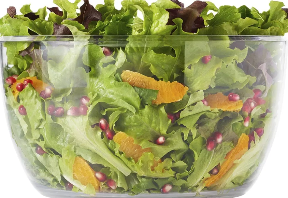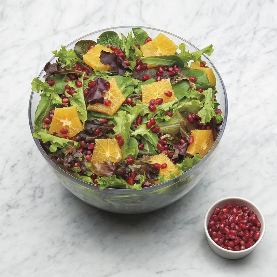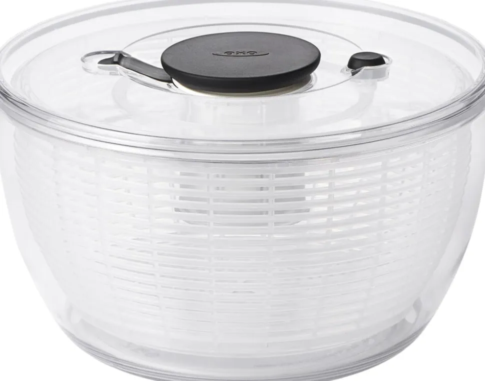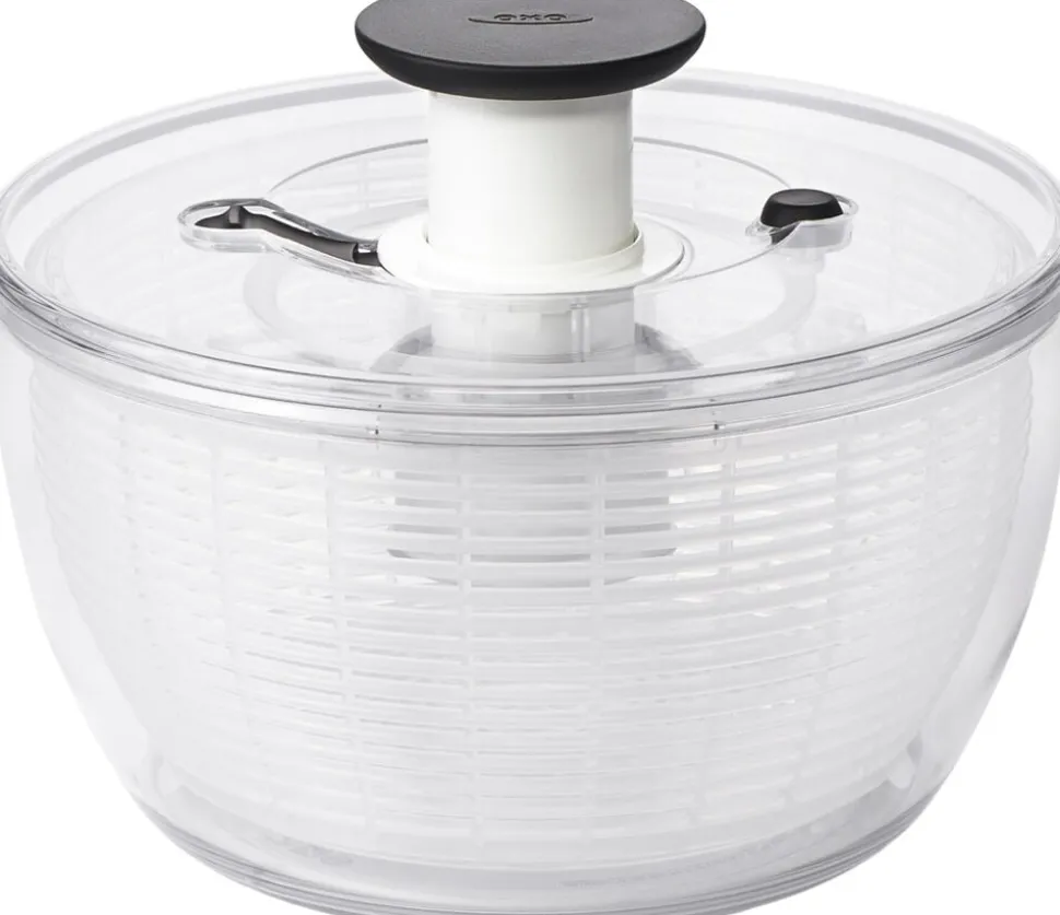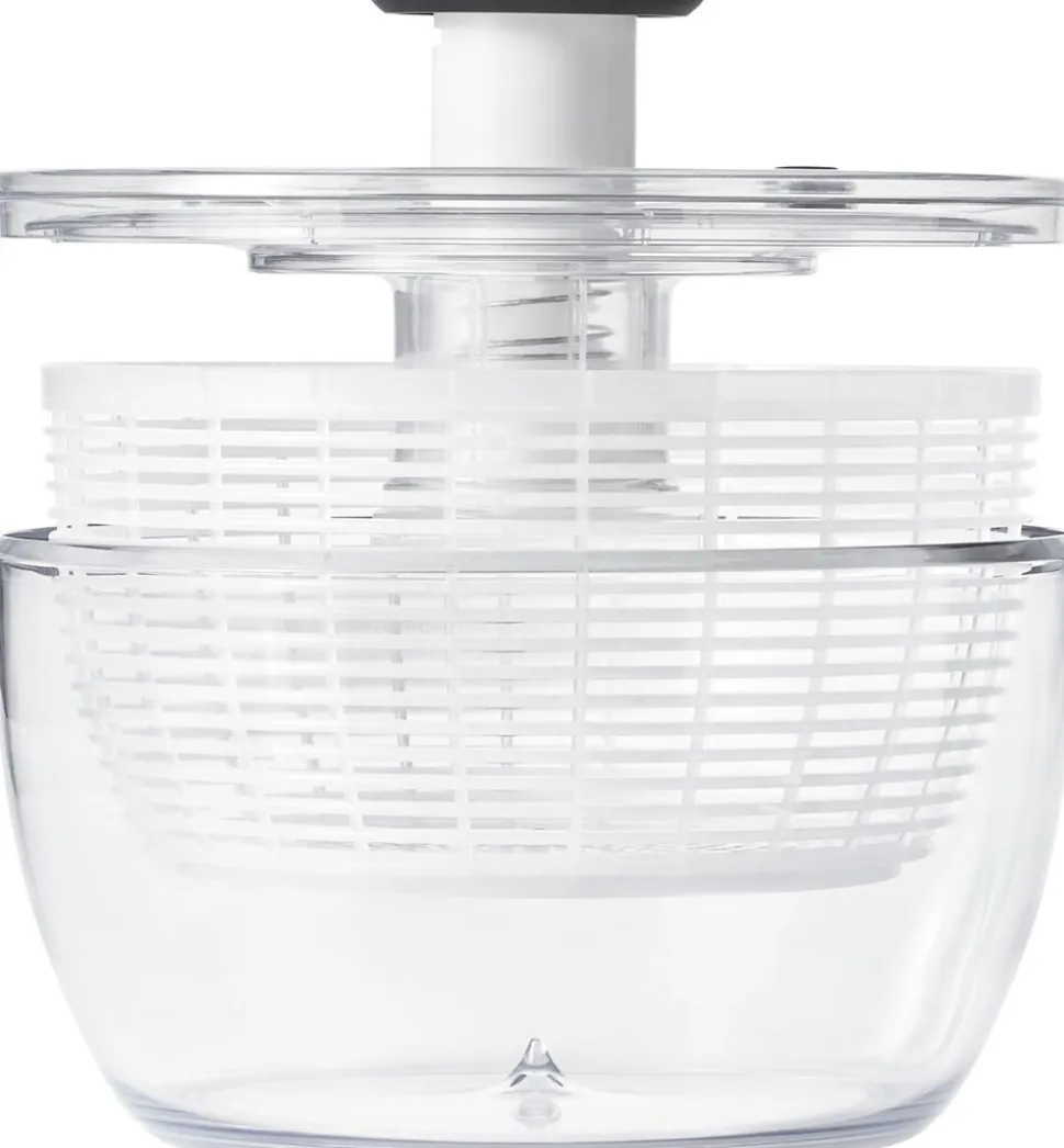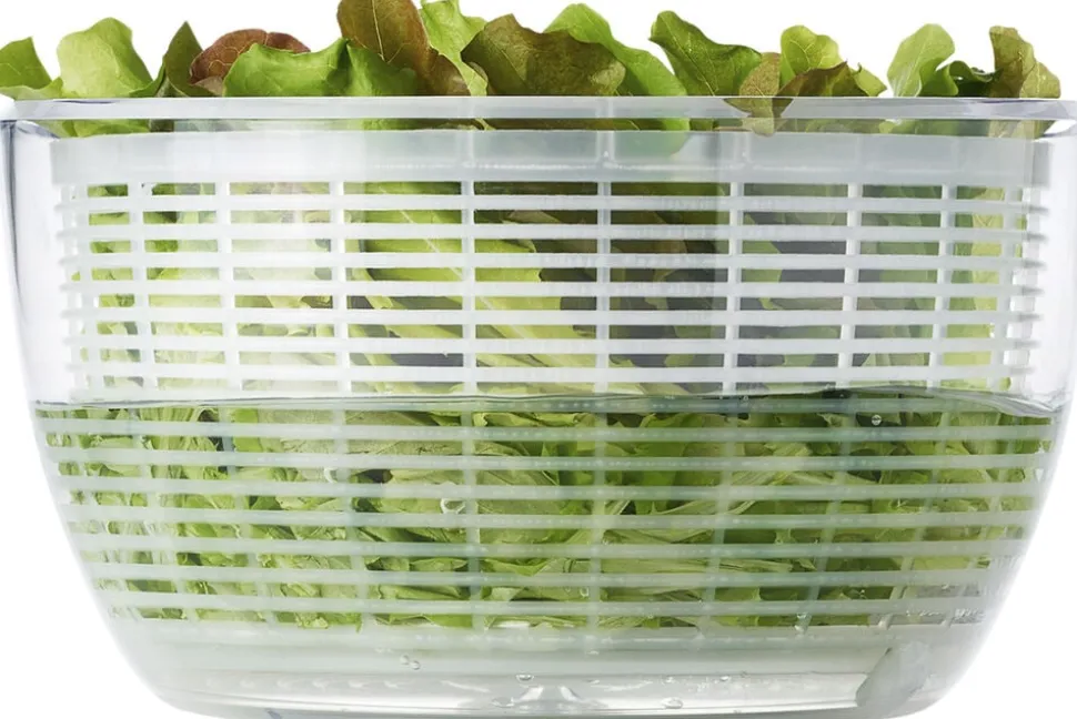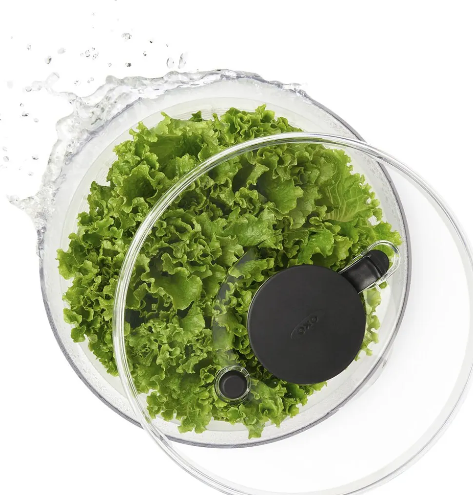 Med OXO Good Grips Salatslynge kan du let skylle din salat inden du spiser den. Læg salaten i kurven og skyl den under hanen. Sæt herefter kurven ned i skålen, på med låget, og lås op for den store knap i midten. Den store knap fungerer som en pumpe og for kurven til at rotere hvorved vandet slynges af salaten. Herefter kan den tørre salat arbejdes videre med. Skål og kurv tåler opvaskemaskine i øverste kurv. Den nederste del af låget kan klikkes af og ligeledes gå i opvaskemaskinens øverste kurv. Den øverste del af låget indeholder en fjeder som ikke kan tåle vand. Denne del kan vaskes af med en klud.