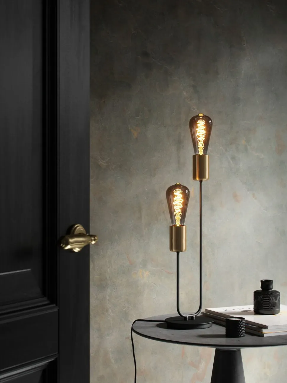 Dekorativ E27-Edison-pære i røgfarvet glas og med et croissant-formet lyskildedesign. Det varme hvide lys skaber en hyggelig stemning.
