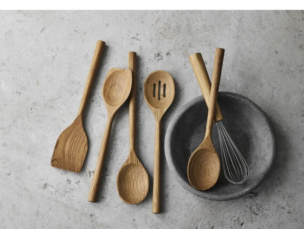 Palet 30,5 x 7,2 x 1,9 cm i smukt, olieret egetræ. Træredskaber er behagelige at arbejde med og skånsomme mod gryder og pander. De har en levende struktur og en varm glød, der passer ind i ethvert køkken. Varen er produceret i FSC®-certificeret egetræ (FSC-C166612). Douron det naturlige valgSerien består af funktionelle køkkenprodukter, hvor det gennemgående materiale er olieret eg. Serien har et enkelt og varmt udtryk, og med træets naturlige struktur får hvert produkt sit helt eget særpræg. Giv træet en god startTræ er et levende materiale, som naturligt ændrer sig over tid. Nogle holder af den varme patina, der langsomt udvikler sig, mens andre ønsker at bevare det oprindelige udtryk det kan bevares med den rette pleje og vedligeholdelse. Før du tager produktet i brug, anbefales det at mætte træet med en smagsneutral madolie fx vindruekerneolie. Træet skal være helt tørt, før du går i gang. Gnid olien ind med en ren klud, lad det trænge ind i mindst 6 timer, og tør derefter overskydende olie af. Vent 24 timer, før du begynder at bruge produktet. Gode råd til daglig brugTræ tåler ikke opvaskemaskine den høje varme og fugt kan få det til at revne. Vask produktet op i hånden med mild sæbe lige efter brug, tør det af med et viskestykke og lad det lufttørre helt, før du lægger det væk. Skulle træet rejse sig eller få små ridser, kan det let slibes med fint sandpapir, når det er helt tørt. Tør efter med en hårdt opvredet klud, lad det tørre og afslut med en ny omgang olie.