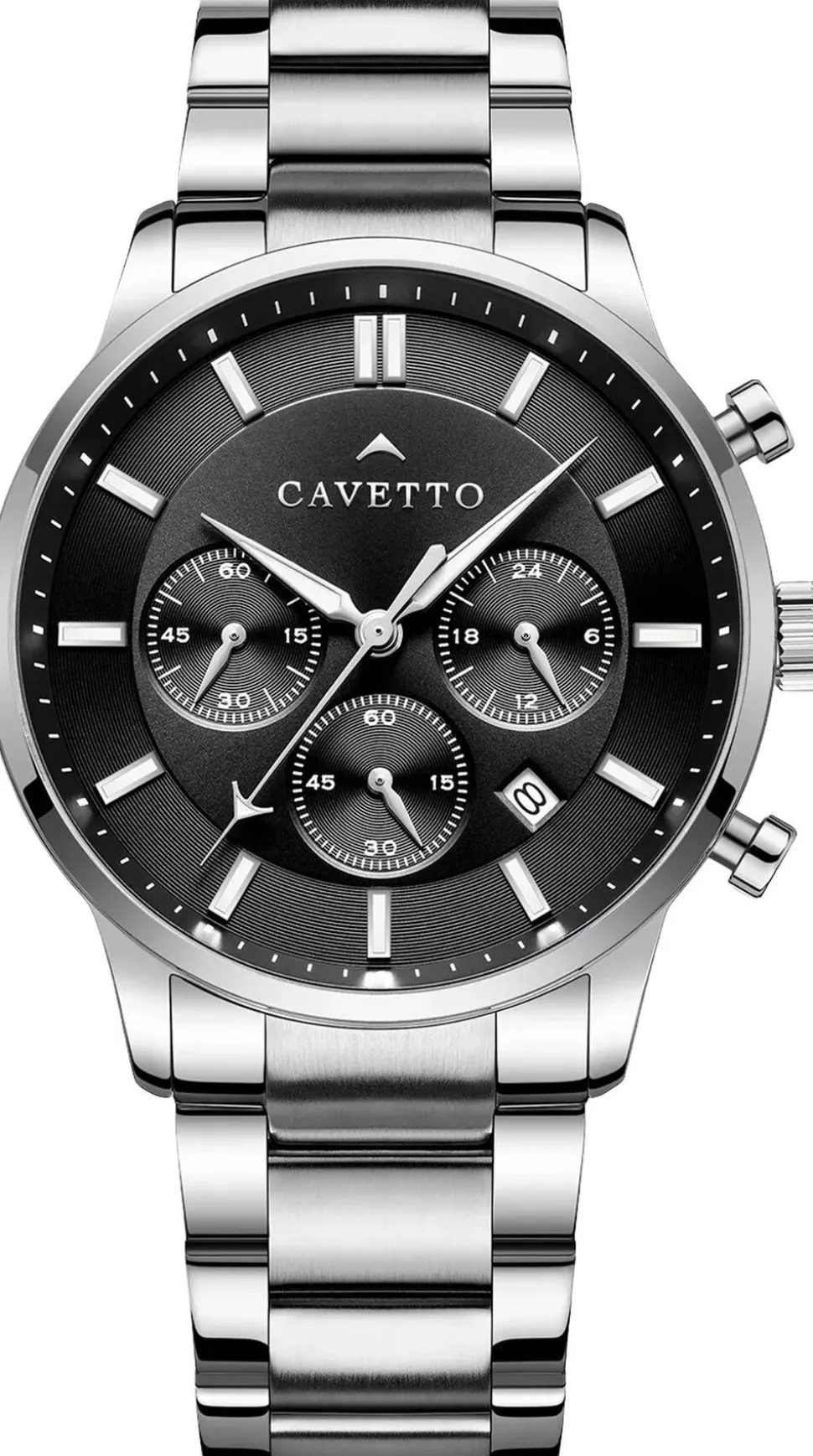 Cavetto Pantheon CV0001 er et ur, der kombinerer moderne design med praktisk funktionalitet. Dets runde urkasse og elegante udseende suppleres af tre kronografer på urskiven, hvilket tilbyder både stil og funktion. Med en diameter på 42 mm skiller dette ur sig ud på håndleddet og gør et imponerende indtryk. Den sorte urskive er parret med sølvfarvede timemarkører og visere, hvilket skaber en slående kontrast, der forbedrer læsbarheden.