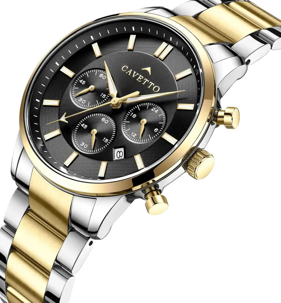 Cavetto Pantheon CV0005 kombinerer imponerende design med praktiske funktioner. Dette ur har en rund urskive med en tekstureret overflade, der tilføjer dybde til udseendet. Den sorte urskive komplementeres af en sølv urkasse og bezel, hvilket skaber et klassisk look. Tre kronografer er symmetrisk placeret og forbedrer urets balancerede design. Lænken i rustfrit stål har skiftevis guld og sølv led, hvilket giver et moderne touch. Foldelåsen sikrer en sikker pasform, hvilket gør det komfortabelt til daglig brug.