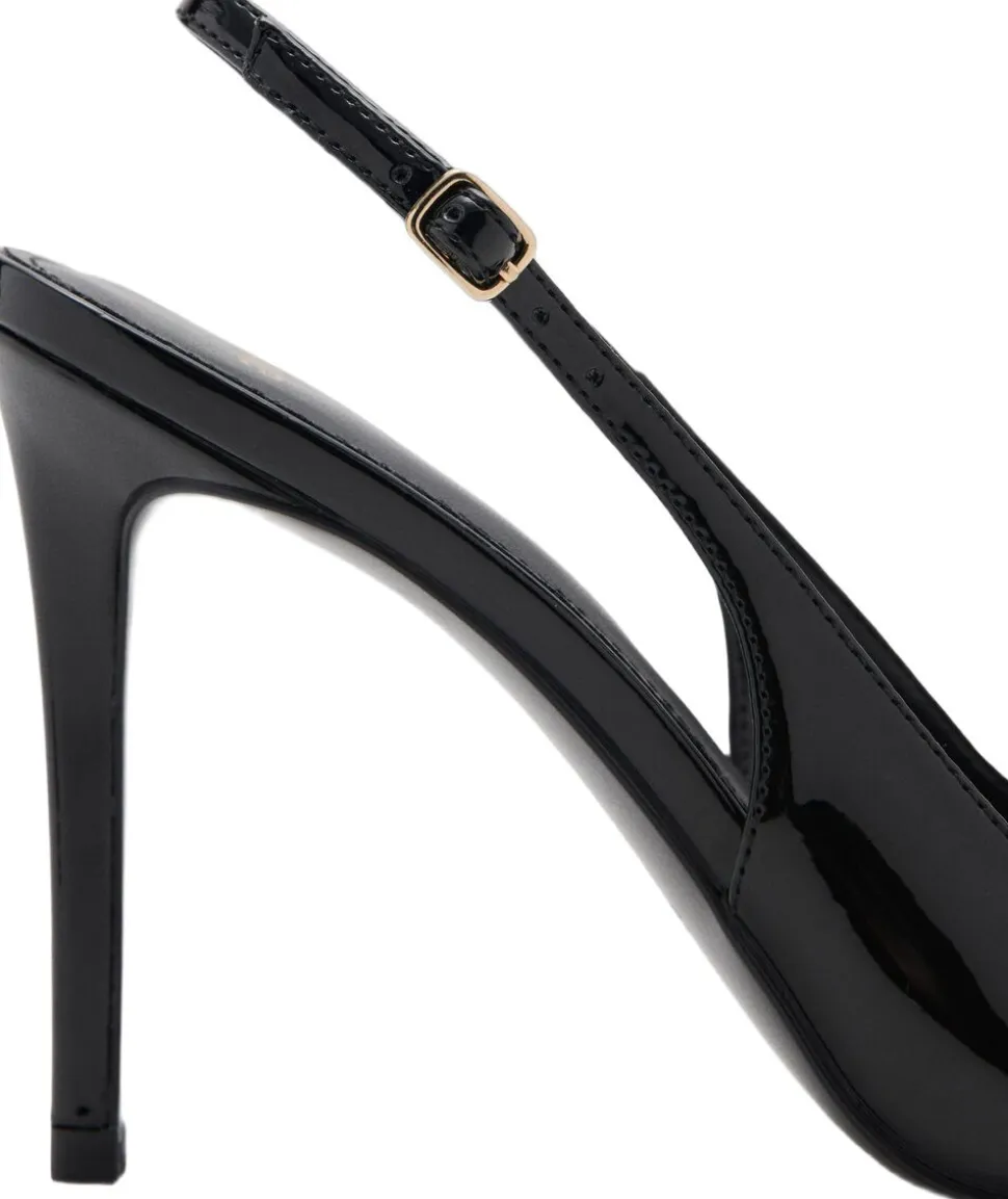 Patentlædereffekt, slingback-Design, spids tå, stilethæle, spændelukning ved anklen, 10 cm hæl