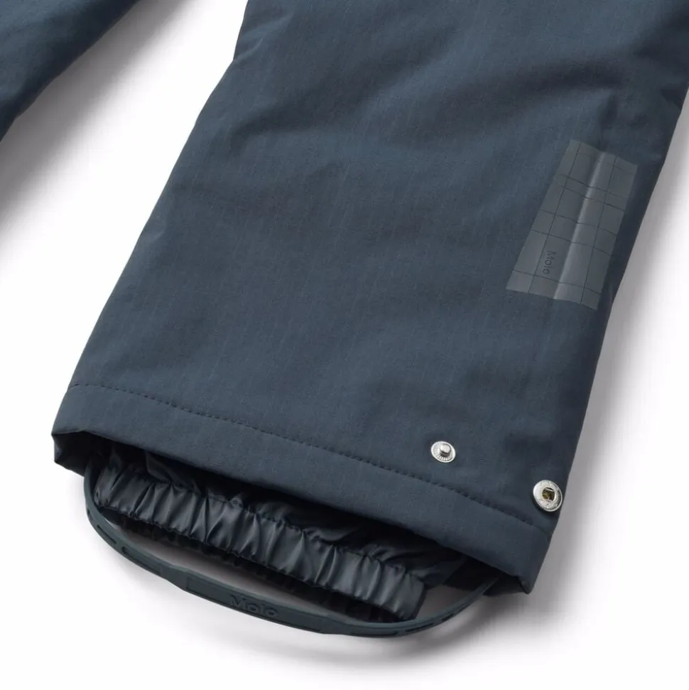 Disse mørkeblå overtræksbukser fra Molo er lavet i genanvendt nylon. Bukserne har elastik i taljen, justerbar elastik indvendigt, bæltestropper til Molos seler (ekstra tilbehør) og justerbar benåbning med snefang. Desuden er bukserne udstyret med en stor refleks bagpå.