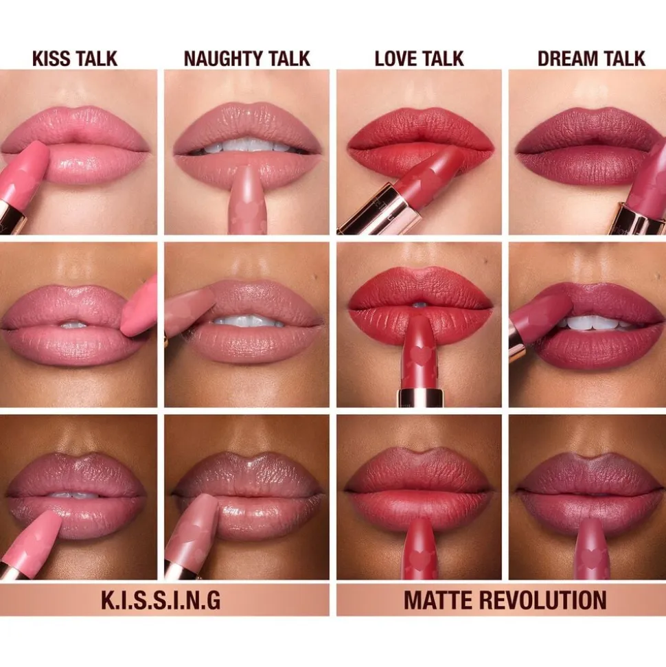 Disse læbestifter i begrænset oplag har Charlottes fugtgivende, satinbløde K.I.S.S.I.N.G-formel og den prisbelønnede, fugtgivende Matte Revolution-formel. Kollektionens etuier i rosa guld er udsmykket med hjerter i rosa rhinsten, der reflekterer lyset og repræsenterer kærlighed! Det er Love-effekten!